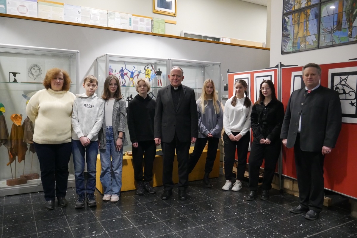 Am 26.1.23 nahm sich unser Bischof Dr. Ulrich Neymeyr wieder mal einen Tag Zeit, um einige Impressionen vom Schulleben der Edith-Stein-Schule aufzunehmen und mit Schüler*innen ins Gespräch zu kommen. Der Besuch begann mit einer stimmungsvollen Begrüßung durch unseren Schulchor. Anschließend gab es Gespräche mit den ukrainischen Schüler*innen, bevor der Bischof die Möglichkeit hatte, an unserem Religionsunterricht teilzunehmen und auch unseren Informatikunterricht zu besuchen. Ein weiterer Höhepunkt des Besuchs war die Teilnahme an der Seminarfachpräsentation zum Thema „Erfindungen für die Zukunft – Gibt es eine Formel für den Erfolg?“. Wir danken Bischof Neymeyr für seinen Besuch und die inspirierenden Gespräche mit unseren Schülern.
