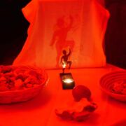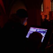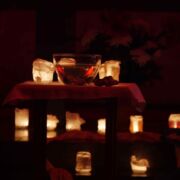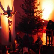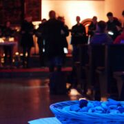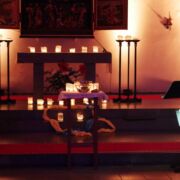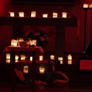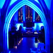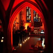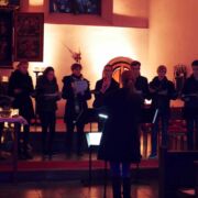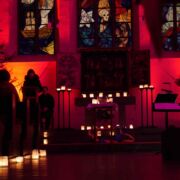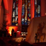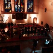 Bei der traditionellen Einstimmung aufs Jahr tauchte die Technik AG die Ursulinenkirche wieder in ein wechselndes Farbenmeer aus Licht.  In diesem atmosphärischen Rahmen entfalteten die Texte und Gebete, die Herr Fritsch und Frau Henning Schönemann herausgesucht hatten und gemeinsam mit ehemaligen Schülern vortrugen, ihre ganz besondere Wirkung. Das Vokalensemble unter Leitung von Frau Wollensak rundete die besinnliche Stimmung mit teilweise meditativen Liedern und Psalmen ab, die auf hebräisch, englisch oder deutsch vorgetragen wurden. In der gut gefüllten Kirche hatten die anwesenden Eltern, Schüler, Lehrer, Ehemaligen und andere Gäste gegen Ende die Gelegenheit, beim Stoneprayer eigene Gedanken und Bitten mit einem kleinen Stein auf den Weg zu geben, der in einer Wasserschale versenkt wurde.