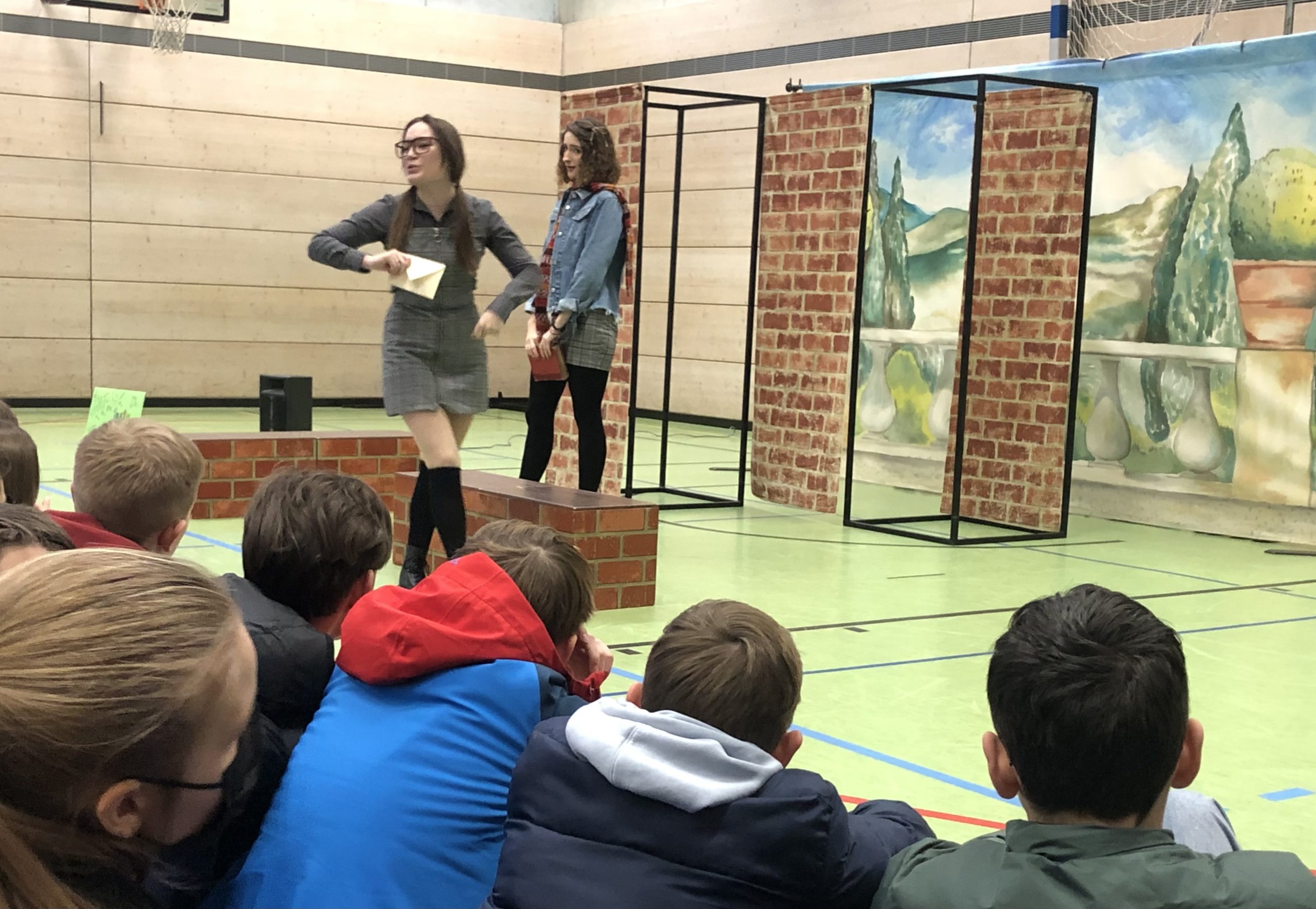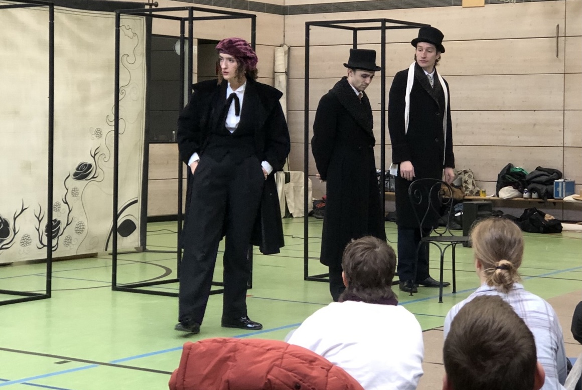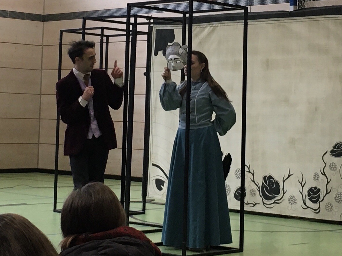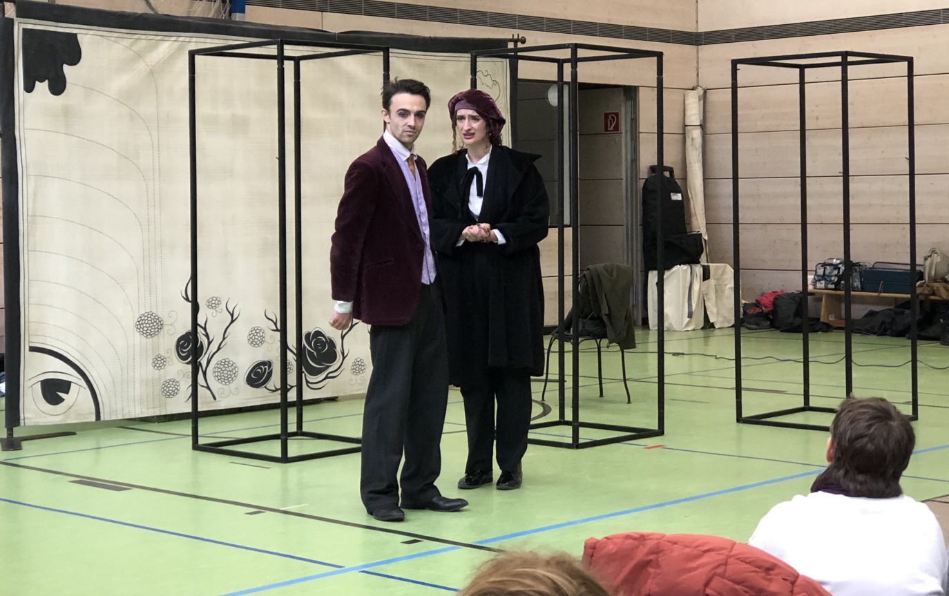 Mit englischsprachigen Adaptionen der Stücke „Two Gentlemen“ von William Shakespeare, sowie „The Picture of Dorian Gray“ von Oscar Wilde, begeisterte die White Horse Theatre Company unsere Schüler*innen. In zwei Vorstellungen – „Two Gentlemen“ für die Klassenstufen 8, 9 und 10, sowie „Dorian Gray“ für die Klassen 11 und 12 – zeigte das vierköpfige Ensemble seine Vielseitigkeit und Spielfreude, wobei immer wieder beeindruckend unter Beweis gestellt wurde, dass auch mit kleiner Besetzung komplexe Stücke mit vielen Charakteren mitreißend gespielt werden können. So verwandelte sich unsere Turnhalle im Nu in eine venezianische boarding school und bald darauf in das Atelier eines Künstlers. Und während bei den beiden Gentlemen noch Humor und Liebe den Ton bestimmten, wurden bei der Inszenierung von Dorian Gray ein wesentlich düsterer Ton angeschlagen und die tiefsten Tiefen der menschlichen Seele erforscht.