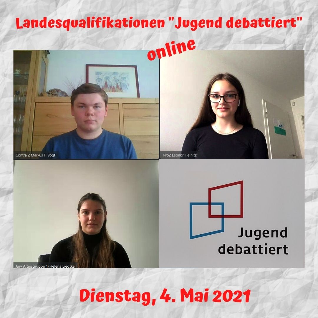 Auch in diesem Jahr ist es wieder gelungen: In beiden Altersklassen konnte sich jeweils ein Debattant bzw. eine Debattantin unserer Schule für die Landesebene qualifizieren. Das ist umso bemerkenswerter, als dass der Wettbewerb in dieser Saison ausschließlich online durchgeführt wurde, was einige ungewohnte Herausforderungen mit sich brachte. Der hohen Qualität der Debatten tat dies jedoch keinen Abbruch. Bei den Landesqualifikationen, die am 4. Mai durchgeführt wurden, erreichte Leonor Heinitz (8a) den respektablen 5. Platz und könnte somit noch als Nachrückerin ins Landesfinale gelangen. Markus Vogt aus der 11e erkämpfte sich in zwei spannenden Debatten einen der heiß begehrten Finalplätze und wird somit am Dienstag, den 11. Mai, um den Einzug in die Bundesqualifikationsrunden kämpfen.