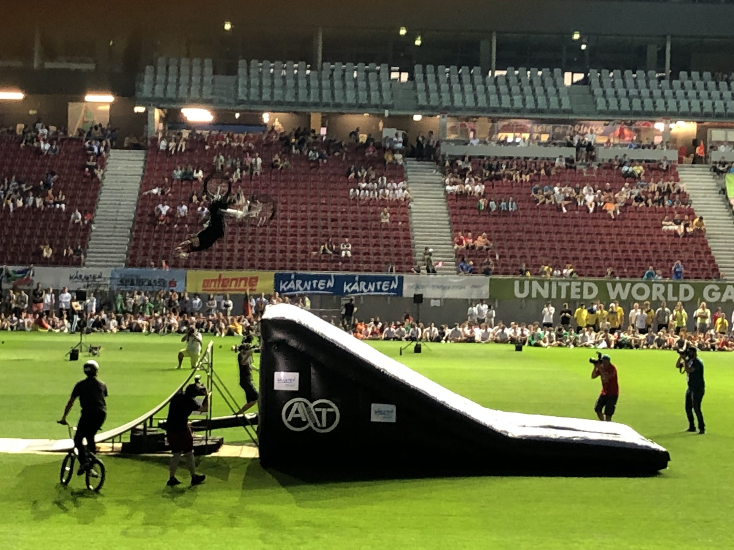Mit der beeindruckenden Eröffnungsfeier im Wörtherseestadion wurde letztlich der erste Turniertag abgerundet. Die vielen tausend Athleten jubelten dem Einzug der über 25 Nationen zu und wurden zusätzlich mit musikalischen Einlagen der Wiener Sängerknaben und einer Trommelgruppe sowie den sportlichen Leistungen verschiedener Akrobatikgruppen und BMX- Profis unterhalten. Natürlich durfte auch das abschließende Feuerwerk nicht fehlen.
