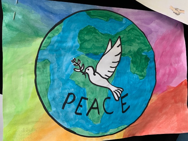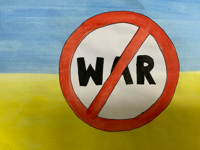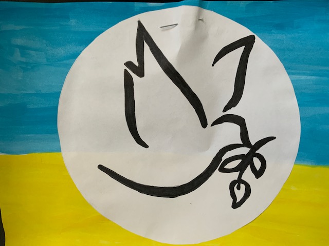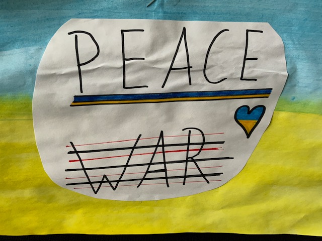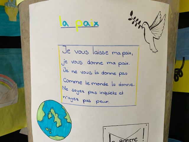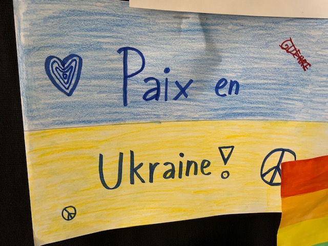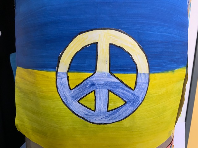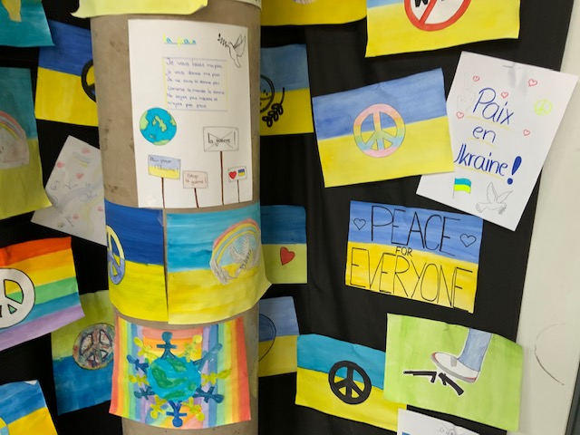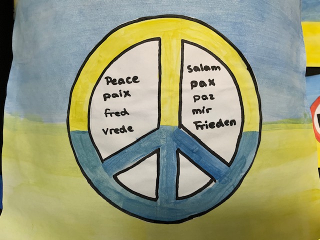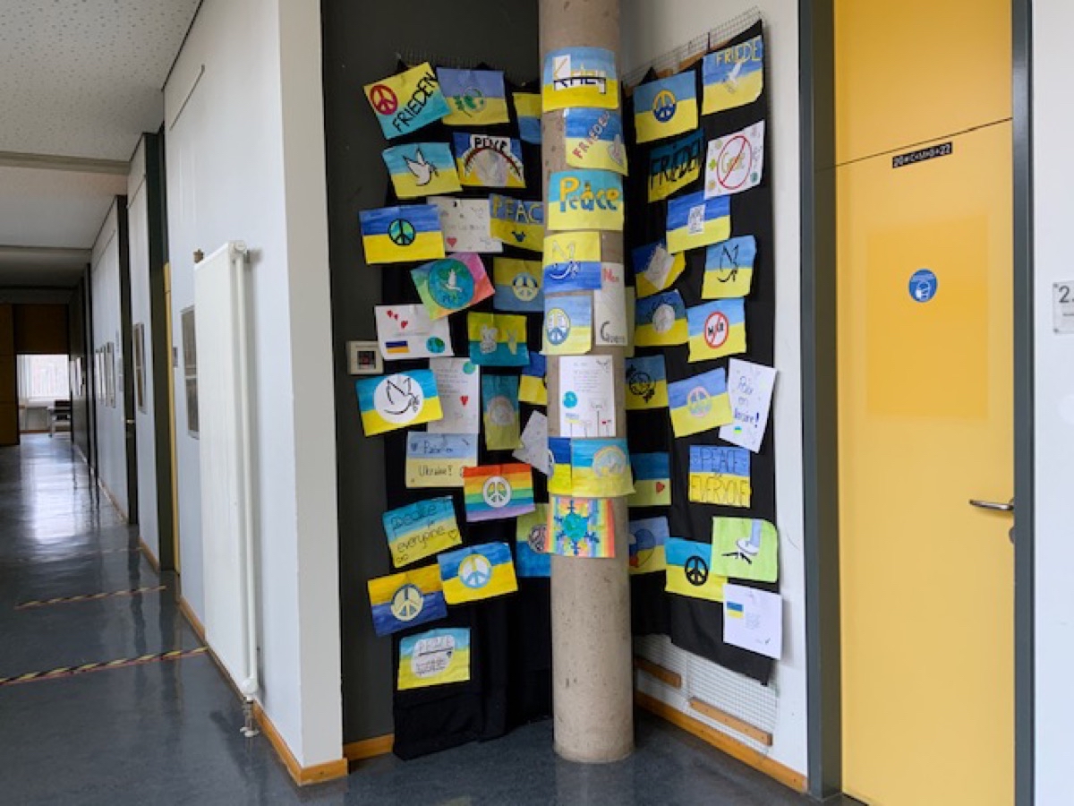 Die Gedanken unsere Schulgemeinschaft sind bei allen Betroffenen dieses Krieges. Einige Schüler der Klassen 5b, 8a, 7a und 7b haben im Kunst- und Französischunterricht Friedensfahnen gestaltet. Ein deutliches Zeichen im Schulhaus für Frieden und Solidarität.