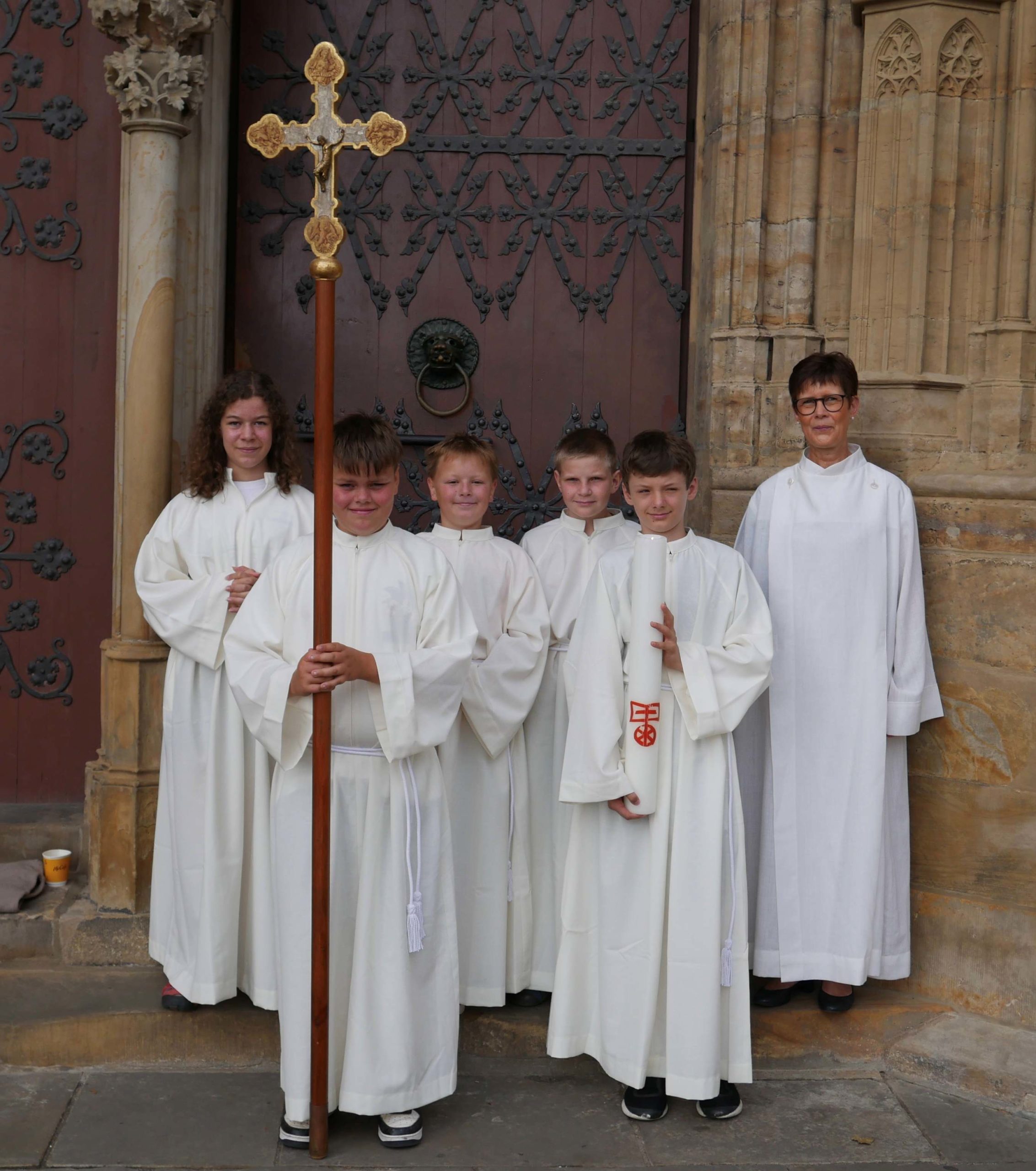 Nach der besonderen Begrüßung der neuen 5. Klassen, den Worten des Schuleiters Dr. Voigt und dem Abschluss des Gottesdienstes mit Dank an alle Beteiligten, zogen die beiden Zelebranten und die Ministrant*innen in ihren nigelnagelneuen Gewändern aus und Schüler und Lehrer machten sich auf den Weg zurück zur Schule, um die erste Woche mit neuen Impulsen für das Schuljahr zum End zu bringen.