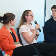 Den Abschluss bildete die Podiumsdiskussion, an welcher ich als Vertreterin der ESS teilnehmen durfte. Wir vier Schüler*innen aus verschiedenen Schulen schilderten unsere persönlichen Zugänge zur Erinnerungskultur und berichteten aus persönlichem Erleben von ihren jeweiligen Projekten. Der Fokus meines Beitrags lag dabei auf unserem Theaterstück „Asking the pope for help“, welches wir im vergangen Jahr anlässlich des Deutschen Katholikentages auf die Bühne gebracht hatten. Auch die anderen Schüler*innen interessierte dieses Projekt stark und es wurden einige Nachfragen gestellt.