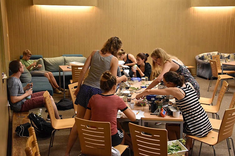 Wird es auch Schnitzel geben? Oder Thüringer Rostbratwurst? Nein, ganz sicher nicht, denn die drei Achtklässlerinnen Johanna Becher, Henrika Arndt und Carolina Schinschick hatten die Idee, in der Projektwoche „Speisen der Welt“ zuzubereiten, also Gerichte auszuprobieren, die in anderen Ländern gern gegessen werden. Dieser Gedanke gefiel ihrer Lehrerin Frau Samaan, die durch die Kochkünste ihres Mannes ganz besonders die syrische Küche schätzen gelernt hat. Vielleicht ließen sich ja mit einem Blick über den Tellerrand die Begeisterung für fremde Kulturen wecken, das Ausprobieren neuer Rezepte anregen und nebenbei ganz praktische Fähigkeiten vermitteln. Zwar fürchtete sie sich etwas vor dem zu erwartenden Chaos in der Küche. Aber auf der anderen Seite war die Vorstellung verlockend, zwanglos und in kleinen Gruppen miteinander zu werkeln, zu schwatzen, voneinander zu lernen und am Ende zu genießen. Also schmiedete sie zusammen mit den drei Projektleiterinnen den Plan, dass vorab für den ersten Tag eine Einkaufsliste für eine Vor-, zwei Haupt- und zwei Nachspeisen erstellt werden sollte. Für den zweiten Tag könnten dann die Ideen der TeilnehmerInnen aus den Klassen 5 bis 7 einfließen. Damit möglichst viele Kinder in den Genuss kommen, sollte das Projekt dann noch einmal wiederholt werden. Der Plan ging auf: Im Nu waren alle 24 Plätze vergeben! Mädchen und Jungen gleichermaßen fanden die Idee super, für einen Unkostenbeitrag von 5 € ihr Mittagessen selbst zuzubereiten. Dank der Unterstützung durch den Förderverein konnten gute Lebensmittel in Bio-Qualität und möglichst wenig Verpackung eingekauft werden. Ein Dankeschön gebührt neben dem Förderverein auch der Martinigemeinde, deren Küche in der Brühler Straße genutzt werden durfte, Frau Malur im Pfarrbüro für die freundliche Vermittlung sowie Frau Thanheiser und Herrn Wust für die perfekte Organisation der Projektwoche! Die drei Projektleiterinnen gaben sich alle Mühe, bereits während des Kochens Teile vom Abwasch zu erledigen, um Frau Samaans Sorgen zu zerstreuen und das Chaos nicht allzu groß werden zu lassen. Dafür konnte Frau Samaan ihnen mit Tipps und Tricks zur Seite stehen und bei einigen schwierigen Handgriffen unter die Arme greifen. Die Thüringer Rostbratwürste, die Gabriel wohl eher zum Spaß vorgeschlagen hatte, wurden nicht vermisst. Es gab stattdessen lecker gewürzten frischen Salat, arabische Pizzen, unterschiedlich gefüllte polnische Piroggen/ russische Pilmenis/ asiatische Dumplings, einen kroatischen Kartoffelauflauf und zum Nachtisch Nanaimo Bars, eine besondere Spezialität aus Kanada, sowie orientalische Baklawa mit gerösteten Nüssen. Lucia, die eigentlich am liebsten Schnitzel mag, hat uns schließlich mit einem wunderbaren Rezept für eine sommerliche Ratatouille überrascht, die unser Favorit wurde und uns schon auf die bevorstehende Urlaubszeit eingestimmt hat.