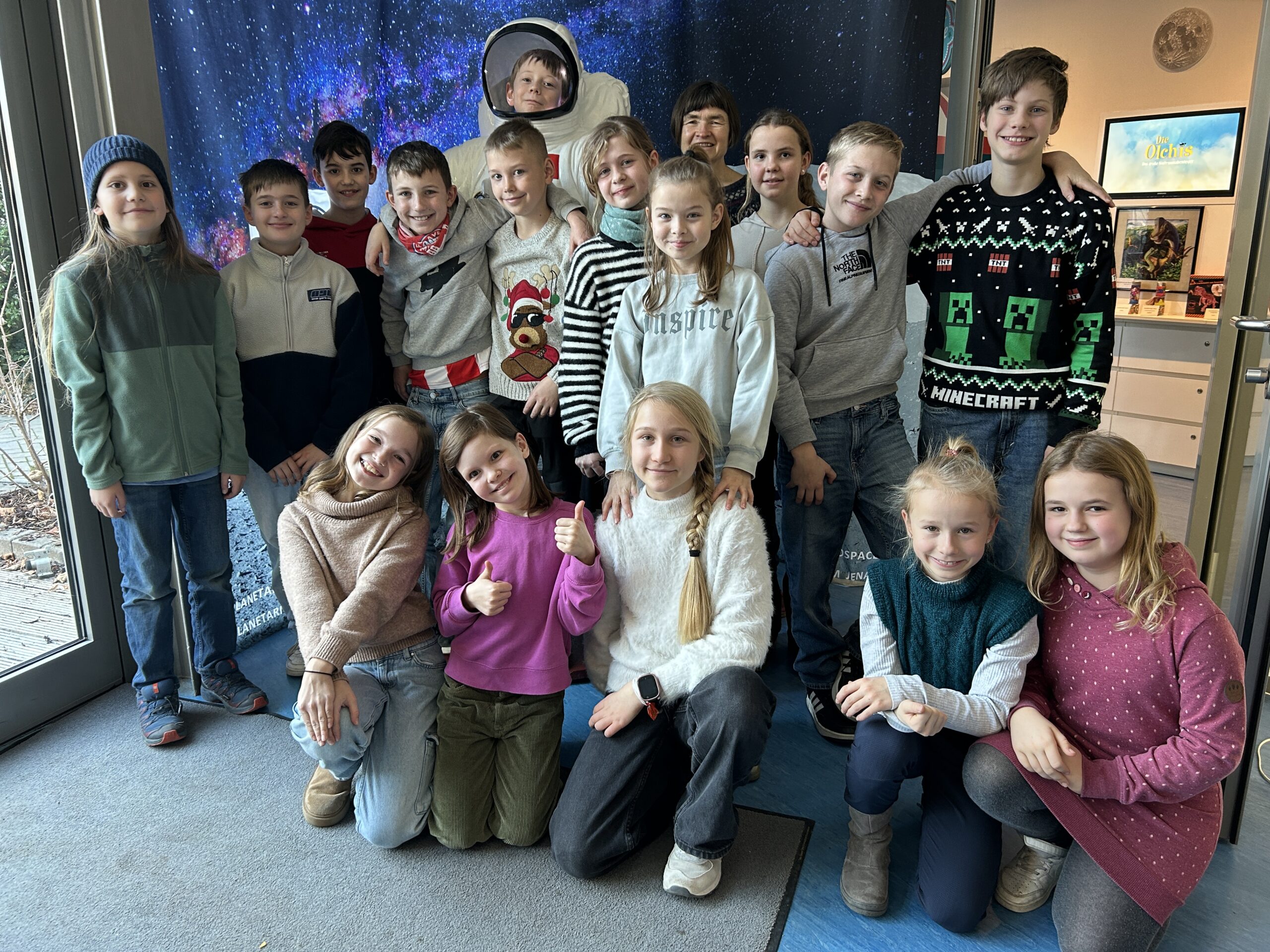 Was war das eigentlich für ein Stern – der Stern von Bethlehem, dem die 3 Weisen aus dem Morgenland gefolgt sind und über den in der Bibel berichtet wird, dass er zu Jesu Geburt hell am Himmel stand? Diesem Rätsel auf der Spur war die Klasse 5a bei ihrem Winterwandertag nach Jena mit Frau Leifer und Frau Samaan. Der Tag begann mit Spiel und Spaß in der Imaginata, es folgte ein kleiner Bummel auf dem Weihnachtsmarkt, bevor wir im Planetarium einen Blick in den Nachthimmel werfen konnten. Die Astrophysikerin Melina zeigte uns auffällige Herbst- und Wintersternbilder, erklärte, wie die Planeten um die Sonne kreisen und nahm uns mit auf eine Reise zu den Plejaden, einem Haufen von Sternen, die vor Millionen von Jahren aus einer Gaswolke entstanden sind. Wir erfuhren, dass eine solche Geburt eines Sterns zwar hell ist, dass man sie aber durch den „Staub“ gar nicht sehen kann, so dass diese Variante für den Stern von Bethlehem schon einmal entfällt. Eine riesige helle Explosion gibt es auch, wenn ein Stern „stirbt“, weil der Brennstoff verbraucht ist, eine sogenannte Super Nova. Das ist theoretisch möglich, allerdings haben die Wissenschaftler keine Überreste davon gefunden. Dann war es vielleicht ein Komet, denn Kometen sind durch ihren Schweif recht auffällig. Aber dagegen spricht, dass die Menschen damals mit Kometen etwas Negatives verbanden, ja sogar Angst davor hatten. Am wahrscheinlichsten ist die Theorie, dass es kein Stern war, sondern dass sich zwei helle Planeten besonders nahe kamen, weil sie gerade von der Erde aus gesehen hintereinander auf ihrer Bahn ihre Runden drehten – entweder Jupiter und Saturn im Sternbild Fische oder Jupiter und Venus im Sternbild Löwe. Wie man das nur herausgefunden hat?! Auf jeden Fall wissen wir nun, wie wir Planeten am Himmel erkennen: Sie funkeln nicht wie selbstleuchtende Sterne, sondern leuchten ruhig und hell im Licht unserer Sonne. Wir bedanken uns beim Förderverein, der die Kosten für den Eintritt in den Vortrag übernommen hat, und werden noch lange an den schönen Wandertag zurückdenken.
