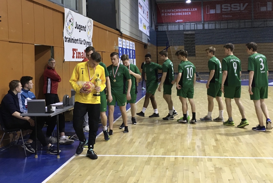 Vier Begegnungen standen auf dem Spielplan. Zum Auftakt gelang ein 7:7 gegen Breitungen, ein dennoch etwas ärgerlicher Ausgang, lag das Team bis wenige Sekunden vor Schluss noch in Führung. Gegen Gera wurde in der zweiten Partie Mit 8:6 der erste Erfolg eingefahren. Als dann der Sieg gegen Nordhausen erneut denkbar knapp noch aus der Hand gegeben wurde und das Spiel erneut mit 7:7 endete, ging die Stimmung in der Mannschaft etwas nach unten, sah man sich schon der Chance um den Titel beraubt. Im Hintergrund rechnete jedoch bereits Trainer Wollborn die bisherigen Ergebnisse durch und kam in Absprache mit der Turnierleitung zu dem Schluss, dass ein Sieg im letzten Spiel dennoch reichen könnte. Doch da stand der mit einigen A-Jugend Spielern des ThSV gespickte und bis dato ungeschlagene Topfavorit aus Eisenach. Die Edith-Stein-Schüler ließen sich davon jedoch nicht beeindrucken. Sie überzeugten defensiv mit einer bärenstarken Verteidigung, gingen vorn schnell in Führung und gaben diese bis zum Ende nicht mehr ab. Als nach unglücklichem Ballverlust Sekunden vor Ablauf der Uhr Torwart Gustav den letzten Angriff der Eisenacher vereitelte, brachen beim Stand von 8:7 mit dem Schlusspfiff alle Dämme und die Halle versank im Jubel der Edith-Stein-Schüler.