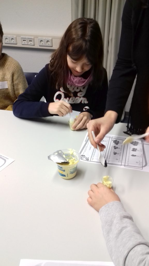 Wir, die Klasse 6A, haben am 12.12.2018 die Kinder-Uni zum Thema „Fühlen, denken, handeln — wie funktioniert der Mensch?“ besucht. Das Experimentieren hat uns viel Spaß gemacht. Wir waren Versuchsleiter und „Versuchskaninchen“ und haben zum Beispiel einen Puddingtest gemacht, wo wir Vanillepudding braun gefärbt haben und andere Kinder gefragt haben, wie es schmeckt (süß, fruchtig oder schokoladig).
