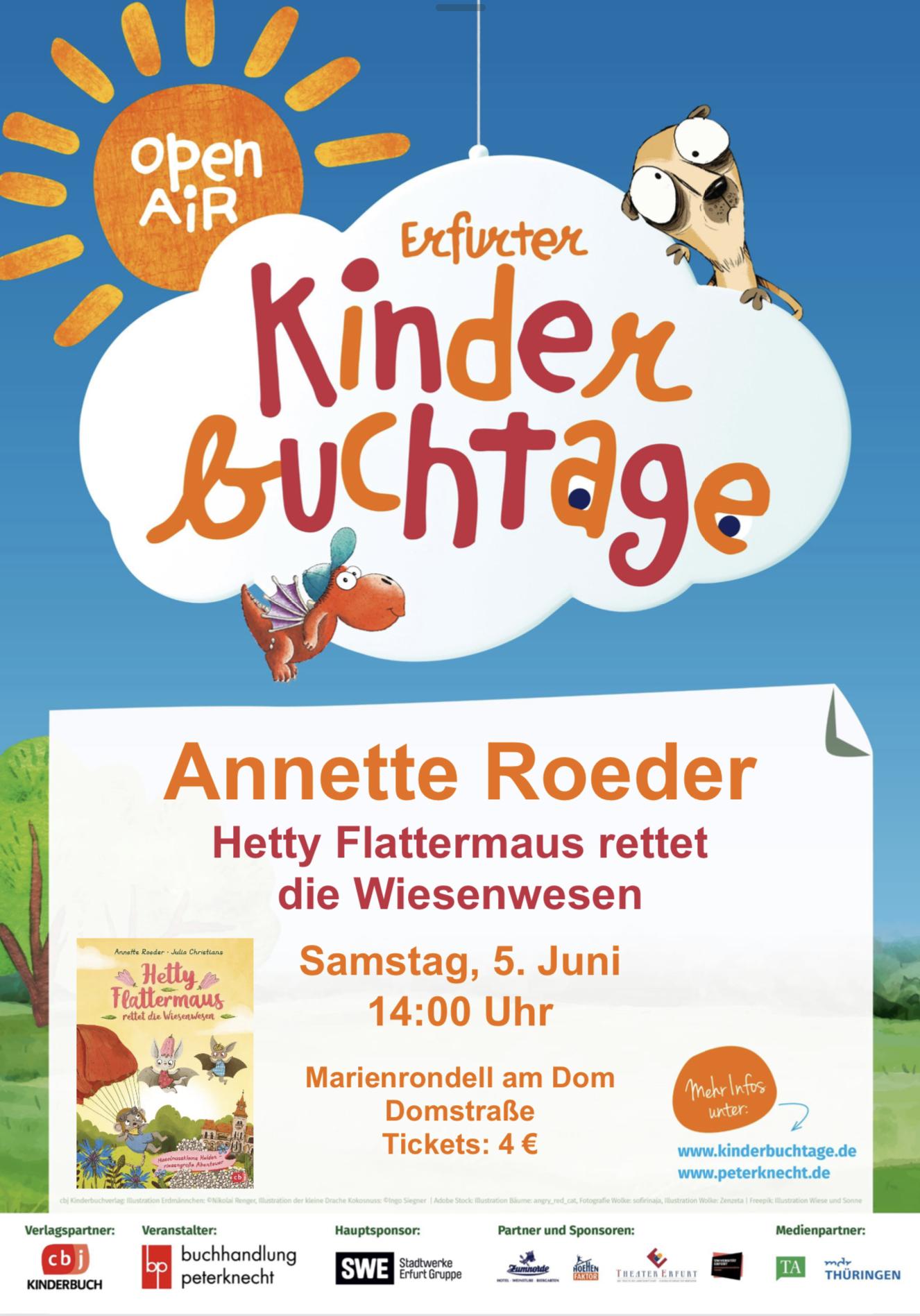 Sehnsüchtig warten viele von Euch sicher wieder auf Veranstaltungen, die Ihr besuchen könnt. Die Erfurter Kinderbuchtage sind wieder so ein Event, auf das ihr Euch freuen könnt. Nach einigen erfolgreichen Freiluftveranstaltungen 2020 hat die Buchhandlung Peterknecht als Organisatorin auch in diesem Jahr eine ganze Reihe von Veranstaltungen nach draußen verlagert. Einen besonderer Ort bietet u.a. die Lesung am 5. Juni am Marienrondell am Dom. Informiert Euch über Programm und Tickets auf www.kinderbuchtage.de oder schaut Euch in aller Ruhe den Flyer an.