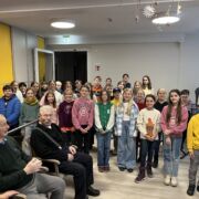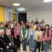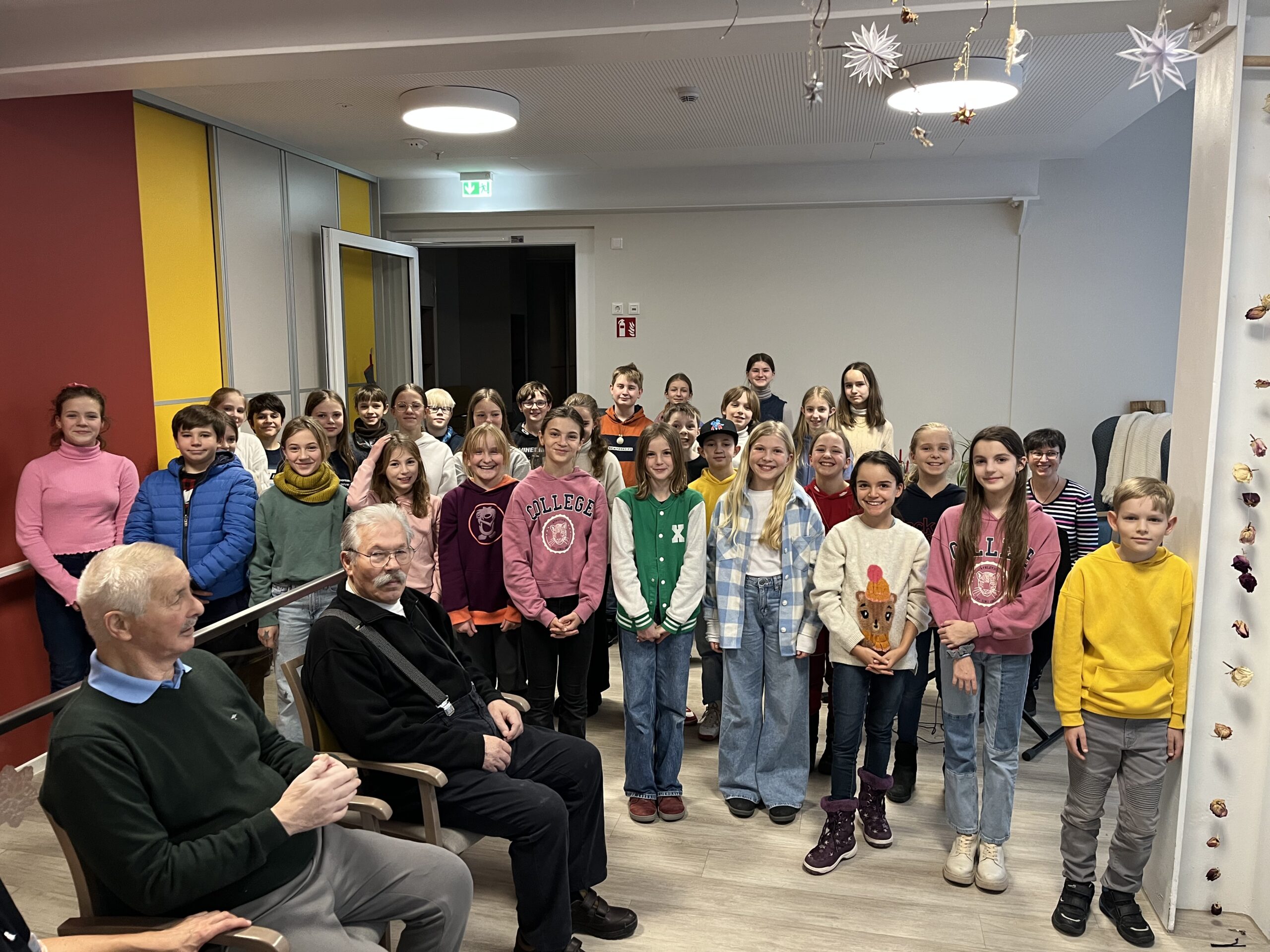 Noch ganz erfüllt vom ESS-Adventskonzert besuchte der Kinderchor ESS-Kids unter der Leitung von Antje Hock und Ekkehard Fellner einen Tag später zur regulären Chorprobenzeit den Caritas-Tagestreff am Anger, um dort in einem Kurkonzert ihr Können unter Beweis zu stellen. Advents- und Weihnachtslieder in drei Sprachen und ein spontanes Geburtstagslied für eine der Heimbewohnerinnen zauberten ein Lächeln und die ein oder andere Freudenträne auf die Gesichter der Zuhörer.