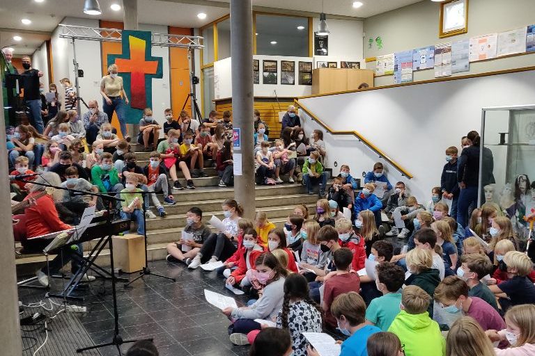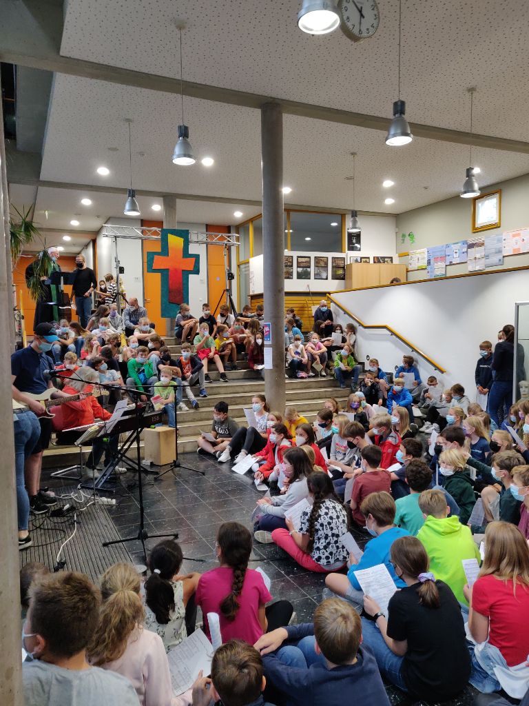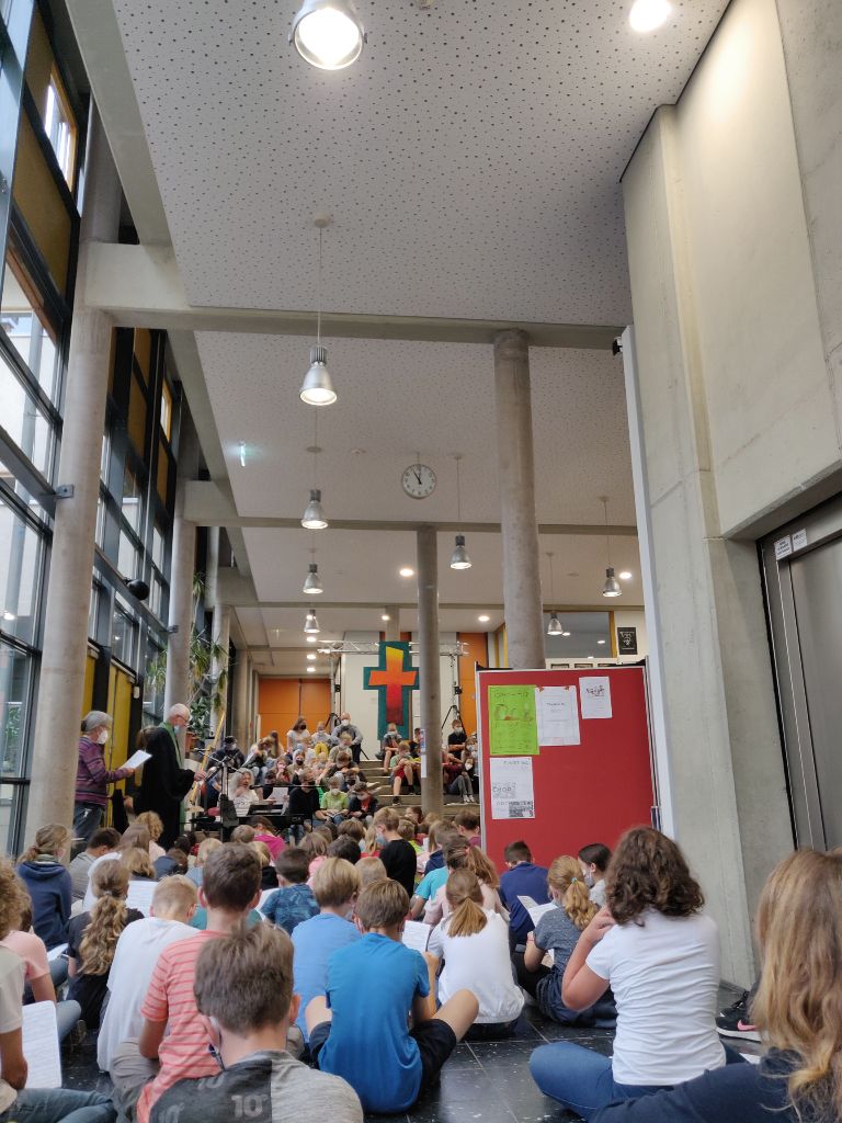 Weniger Glück hatten die 7. und 8. Klassen, denn direkt im Anschluss an den ersten Gottesdienst regnete es sich richtig ein. Also wurde der zweite Gottesdienst spontan in das Foyer der Schule verlegt. Dort durften sich aufgrund der Abstände aber nun nur die 5. Klassen und zwei 6. Klassen einfinden. (Für die 7. und 8. Klasse wird schnellstmöglich der Gottesdienst geplant und stattfinden.)
