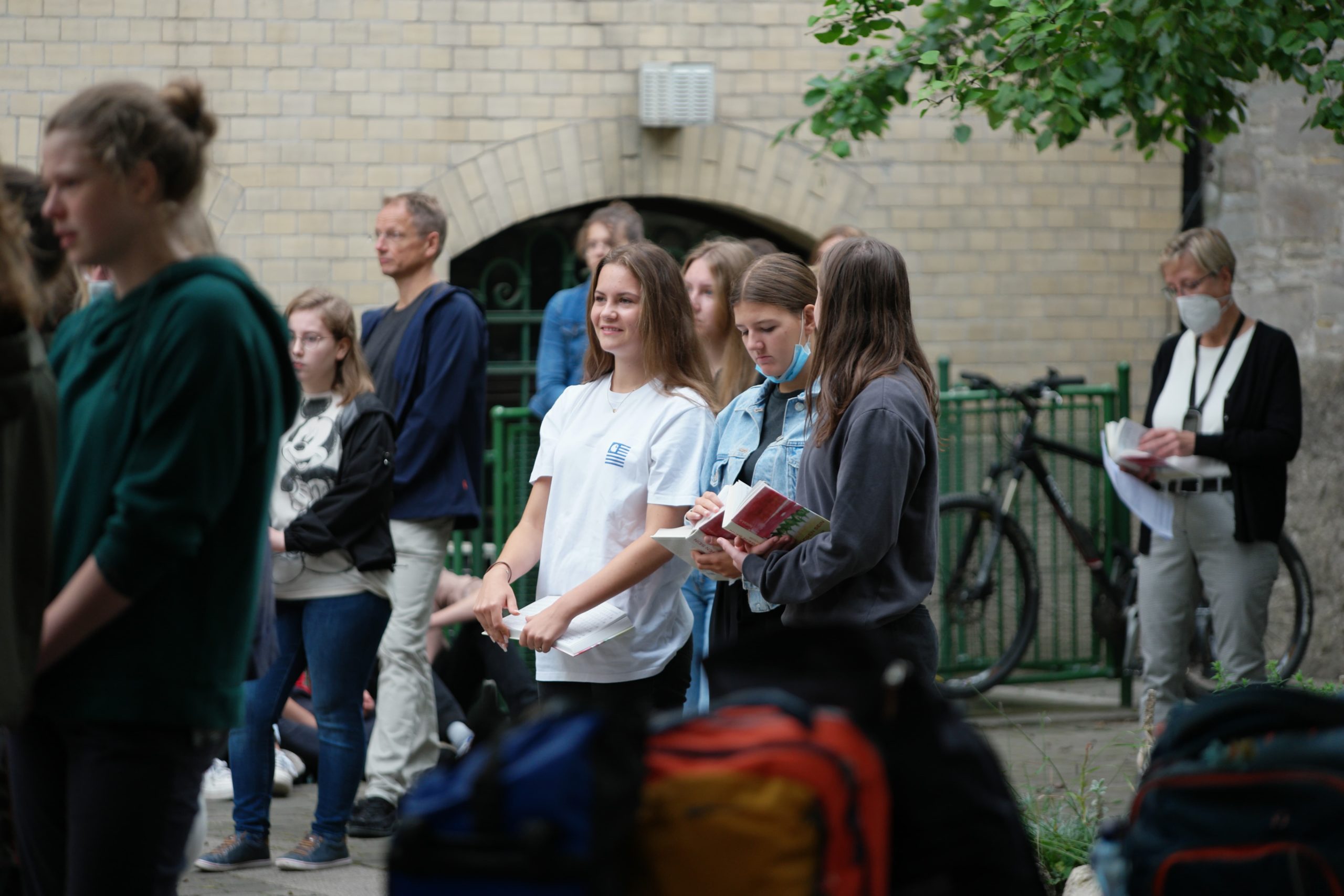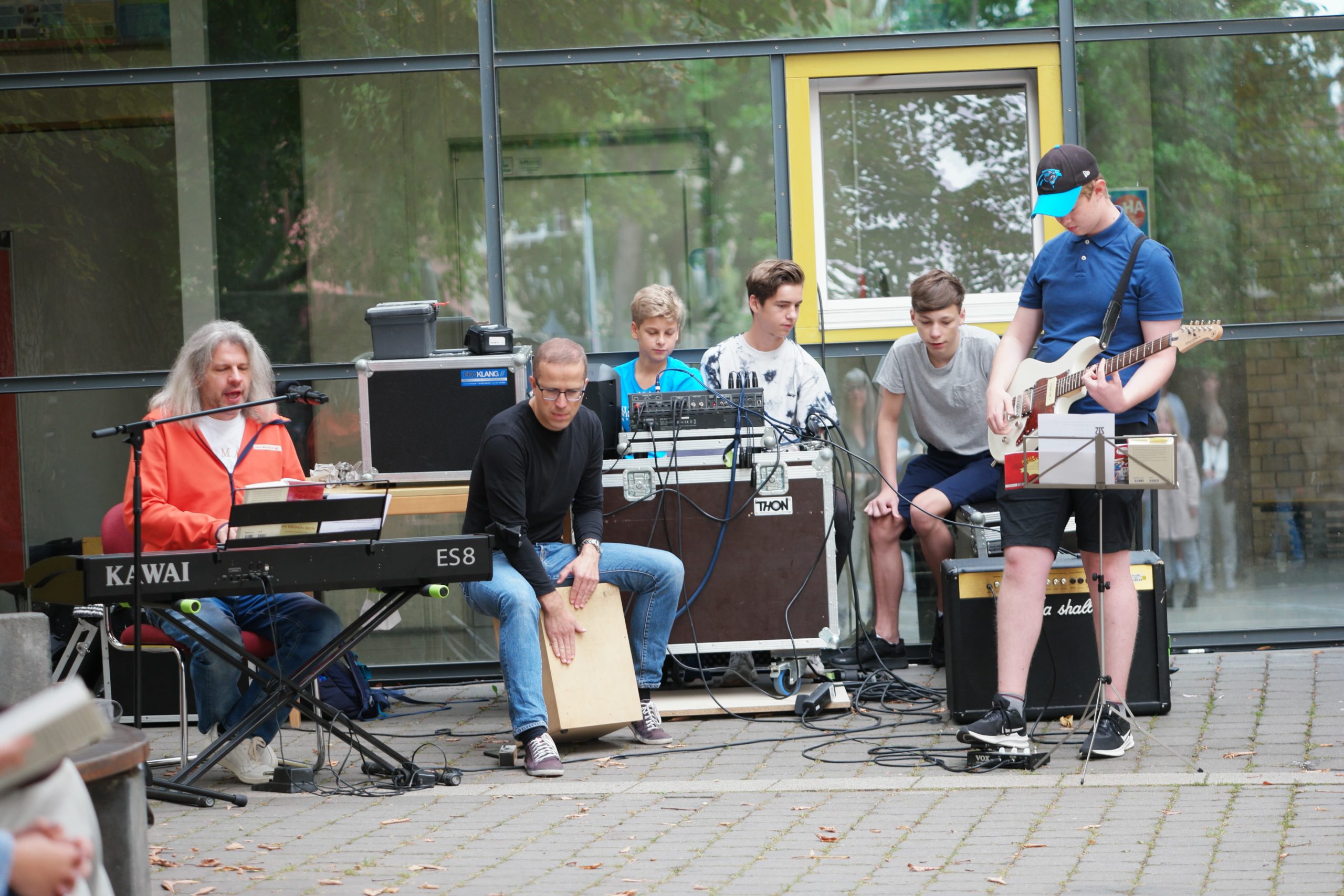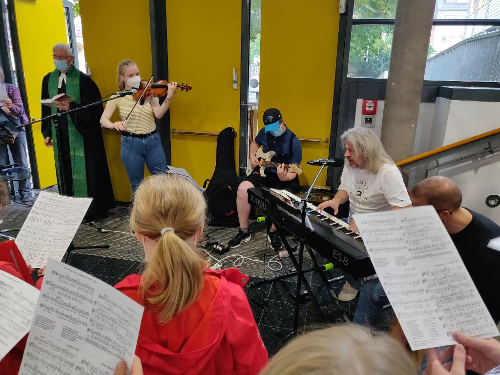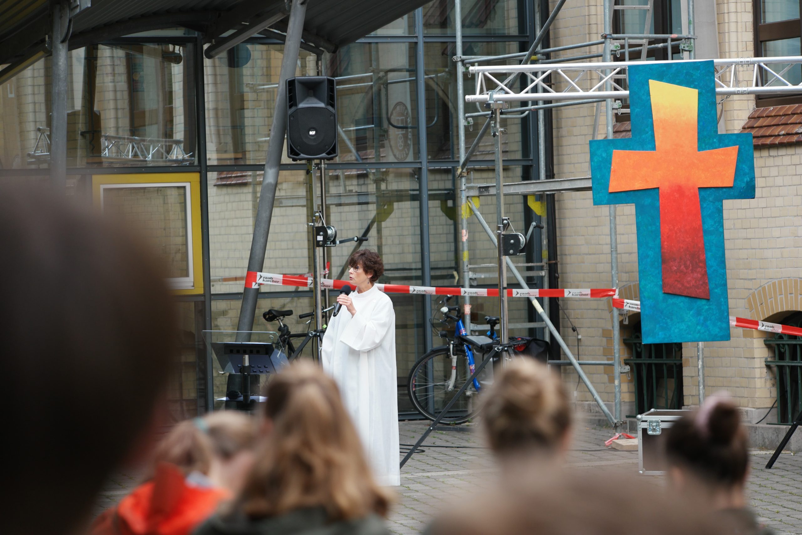 So wurde der Hof zur Kirche: das große Kreuz im Hintergrund, die Gemeinde bestehend aus allen Schülerinnen und Schülern der 9. bis 11. Klassen überall verteilt, als Leitwort der Psalm 36, 6-10, den Frau Hennig-Schönemann sehr passend zu dieser Zeit mit vielen Hoffnungsbotschaften an die Schülerinnen und Schüler weitergab. Gott ist nicht weit weg, ER ist in den Tälern unseres Lebens und in der Weite unserer Entscheidungen. ER geht mit uns mit, egal was kommt. Zu Beginn eines Schuljahres, der viele Fragen und Ängste in sich hat, waren diese Botschaften auch ein Wunsch der Schulseelsorgerin. Die Band, bestehend aus Herrn Fellner, Herrn Habermann, Rufus Elß und der ehemaligen Schülerin Annika Schuhmacher, wurde tatkräftig durch die Technik-AG unterstützt und riss alle zum Singen – endlich mal ohne Maske! – mit.