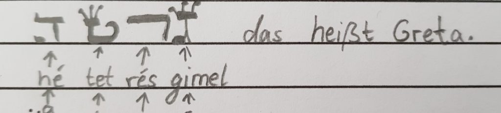 Wir konnten uns viele Sachen, wie Leder, getrocknetes Harz und Schriftzüge aus dem Hebräischen anschauen. Zuletzt durften wir das Zeichnen hebräischer Schrift ausprobieren. Wir erfuhren, dass man im Hebräischen von oben rechts nach unten links schreibt.