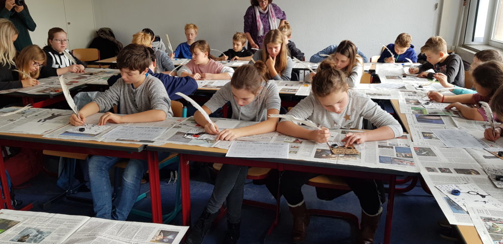 Als nächstes zeigte uns Herr Fernadi, wie man aus Truthahnfedern Schreibfedern schneidet. Die Federn, mit denen wir geschrieben haben, hat Mark selbst geschnitzt. Er hatte sogar eine Linkshänderfeder.