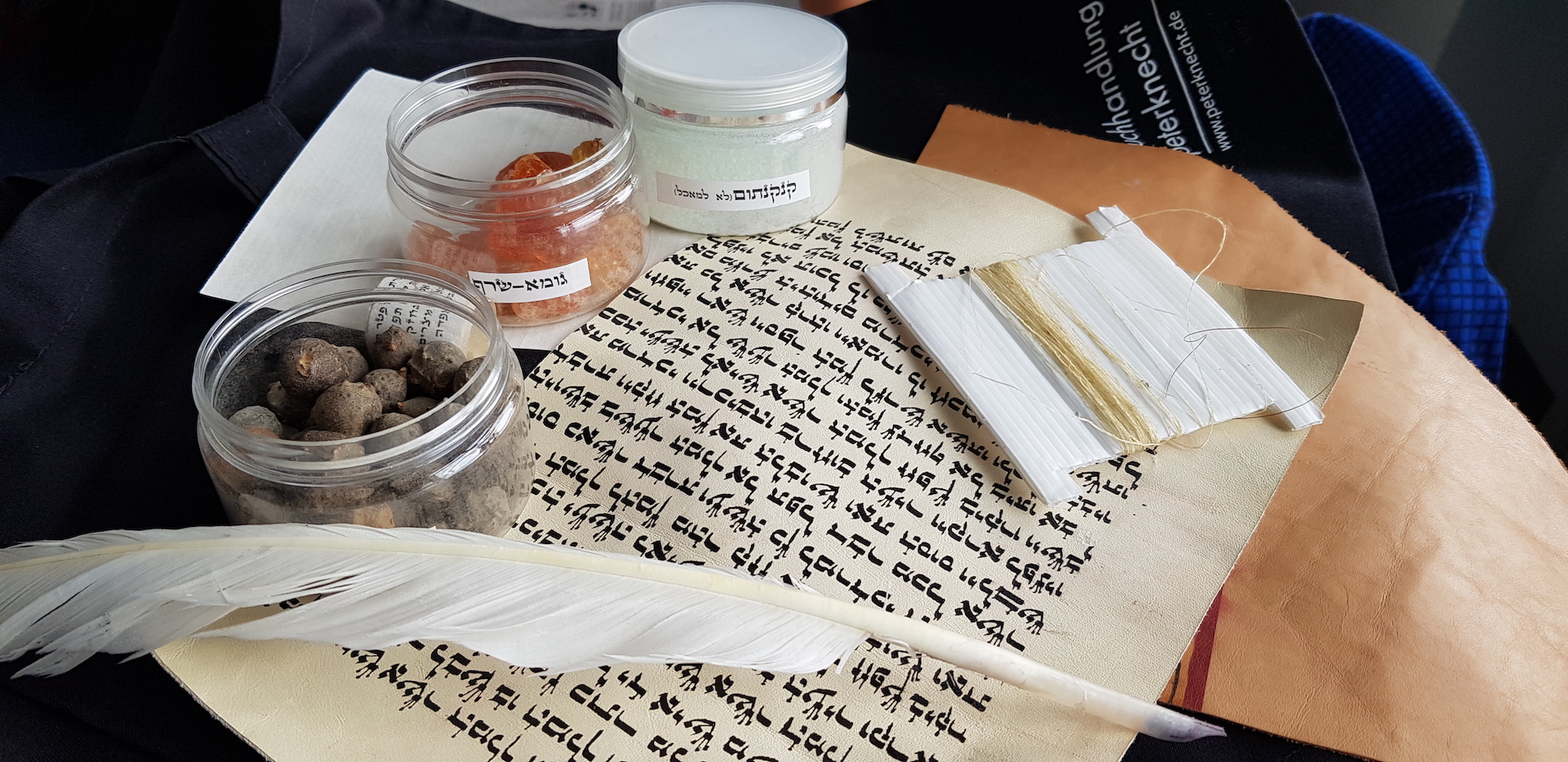 An unserem ersten Studientag lernten wir, wie man selbst Tinte herstellt und hebräisch auf Pergament schreibt. Pergament ist die Haut von Tieren. Um ein großes Blatt oder sogar ein Buch zu erhalten, näht man das Pergament mit Sehnen zusammen. Es werden nur koschere (=reine) Tiere verwendet. Herr Mark Fernadi, ein Schreiber aus Jerusalem, erklärte uns, dass jüdische Gläubige immer einen Gebetsriemen tragen. An ihm befindet sich eine Schatulle. Sie enthält eine kleine Rolle mit einem Gebet darauf.
