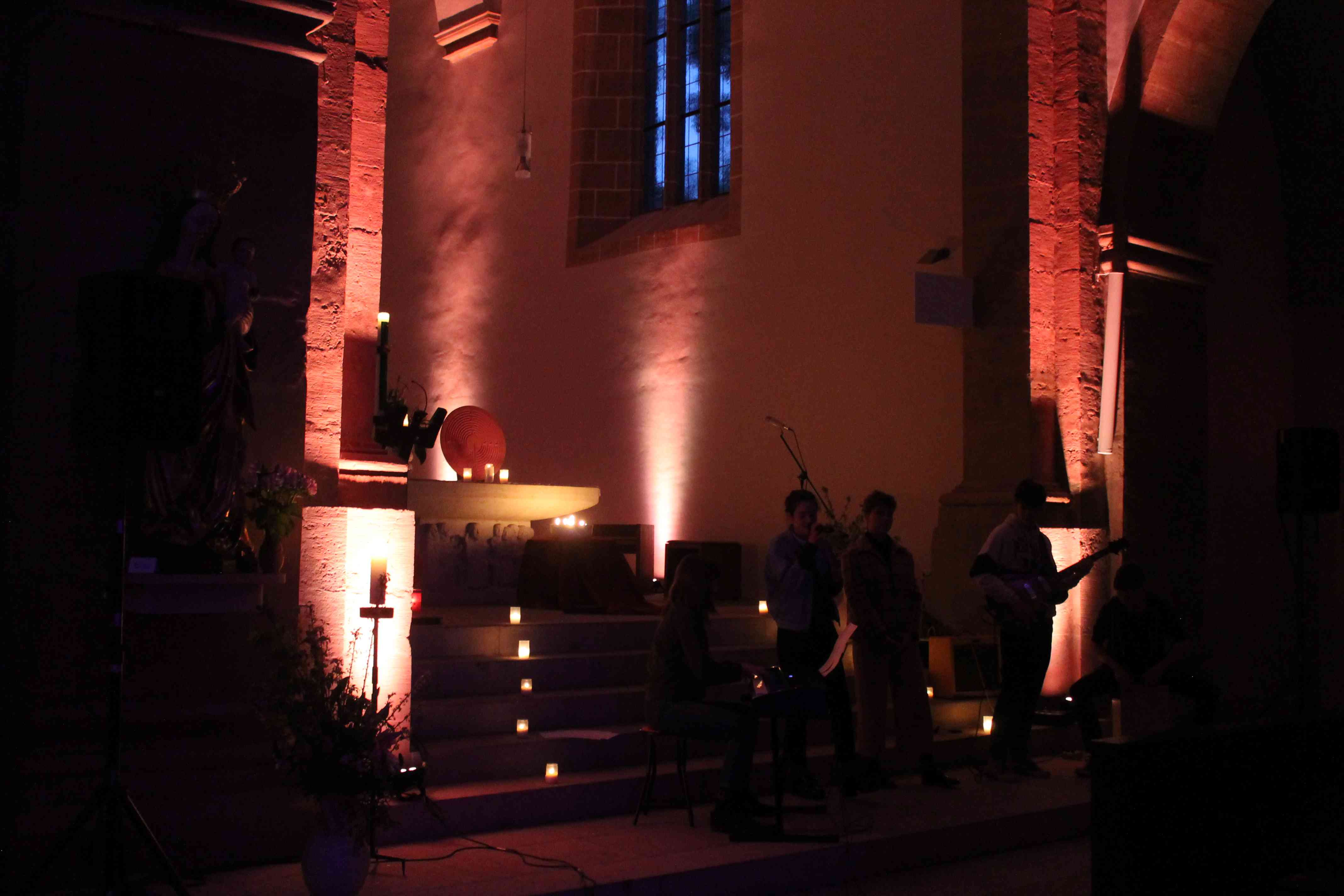 Mit Hilfe der Technik-AG wurde wieder einmal die Schottenkirche in ein so ganz anderes Licht getaucht und bot den Hereinkommenden eine völlige andere Perspektive. Orte des Verweilens und des in sich Hineinhörens boten die Gelegenheit dieses einmalige Gotteshaus für sich und mit anderen neu zu erfahren. Dazu kamen wunderbare Klänge von Schülerinnen und Schülern: Am Saxophon Perpetua Schneider, von der Band Colours und von Herrn Fellner am Klavinova. Dieser Abend in der Schottenkirche hat viele Menschen berührt und einen – im wahrsten Sinne des Wortes – Nachklang hinterlassen. Licht – Klang – Raum eben!