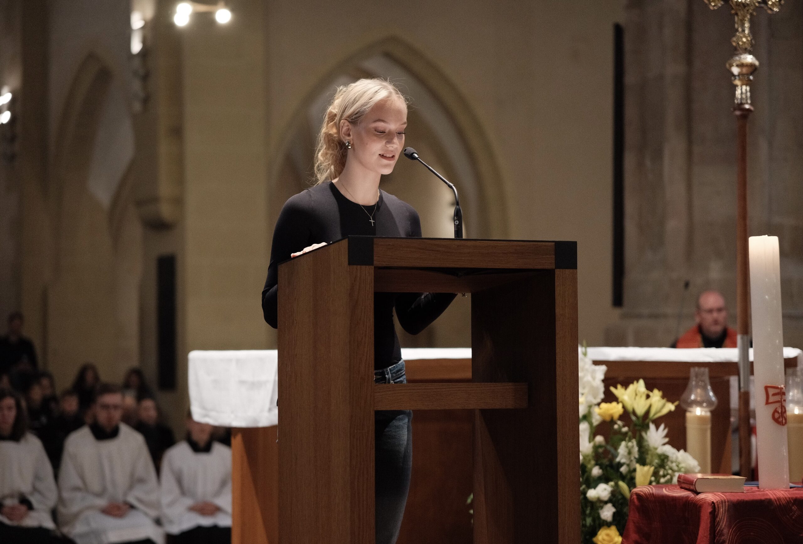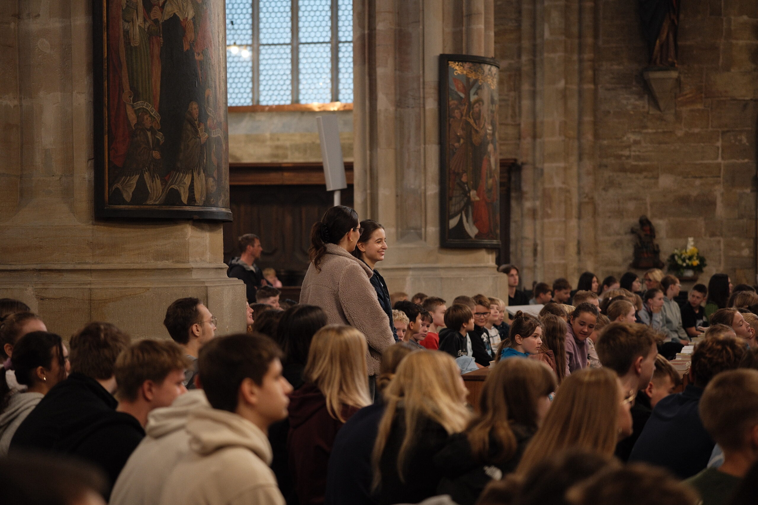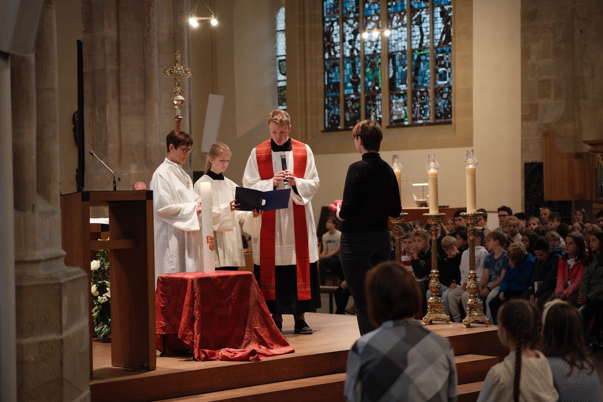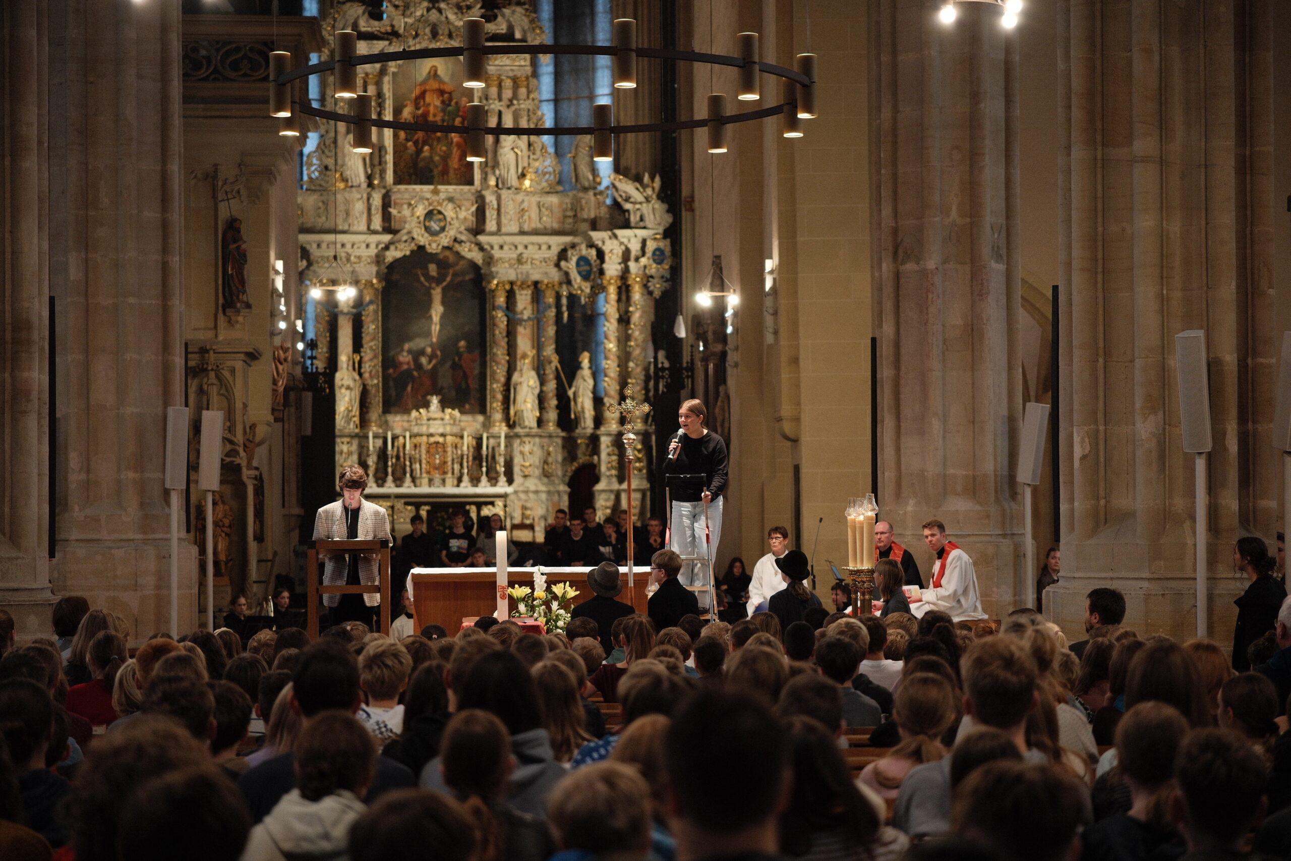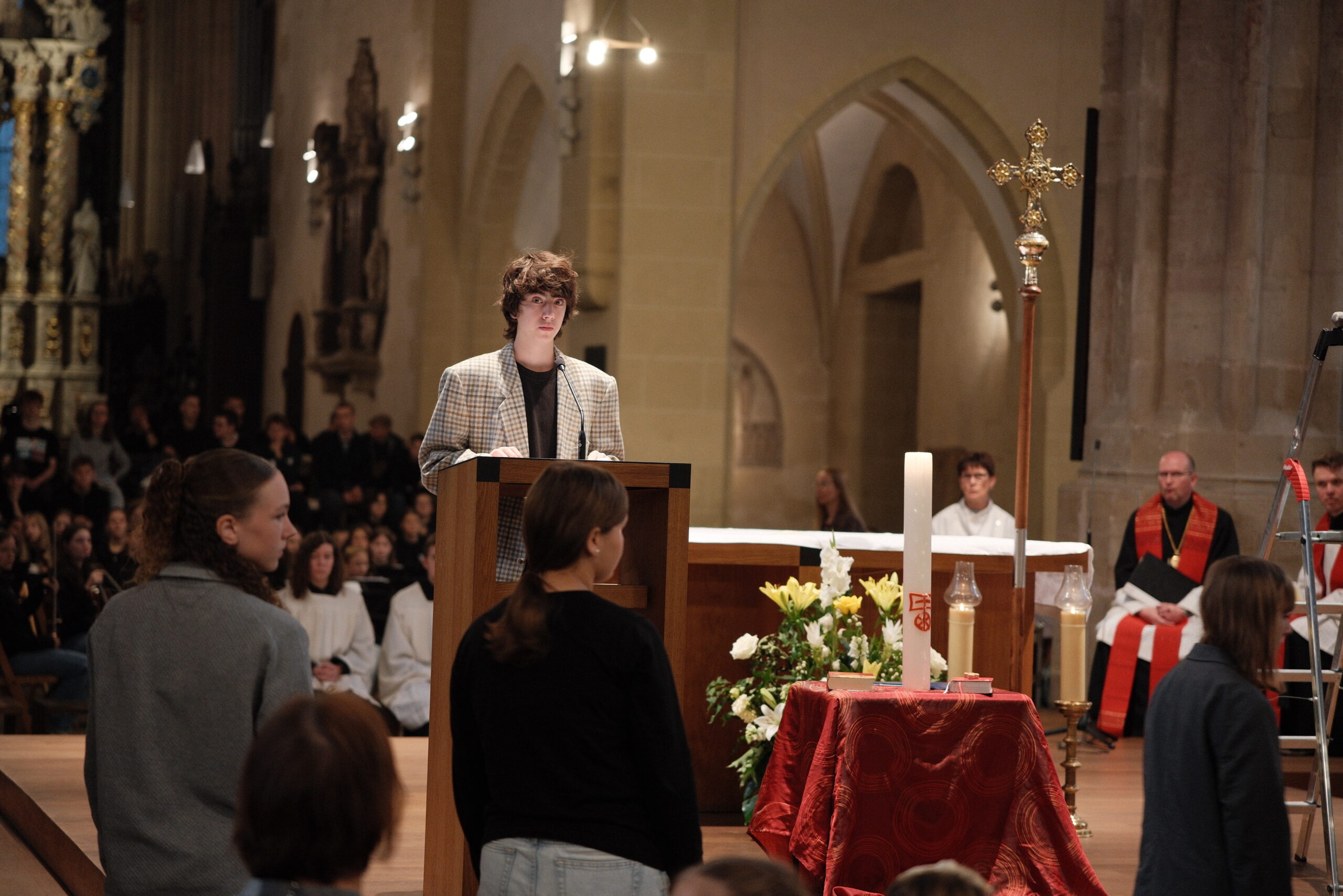 Trotz erneut widriger Wetterbedingungen fand, zum diesjährigen Patrozinium von Edith Stein, im Dom der traditionelle Gottesdienst mit der gesamten Schulgemeinschaft statt. Unter der Leitung von Generalvikar Dominik Trost, sowie unserer Schulseelsorgerin Christiane Henning-Schönemann wurde unserer Namenspatronin gedacht, wobei Passagen ihres Lebens und Wirkens vorgelesen oder durch die DuG AG vorgespielt wurden. Schüler- und Lehrerchor sowie Orchester sorgten für die passende musikalische Untermalung des Gottesdienstes.