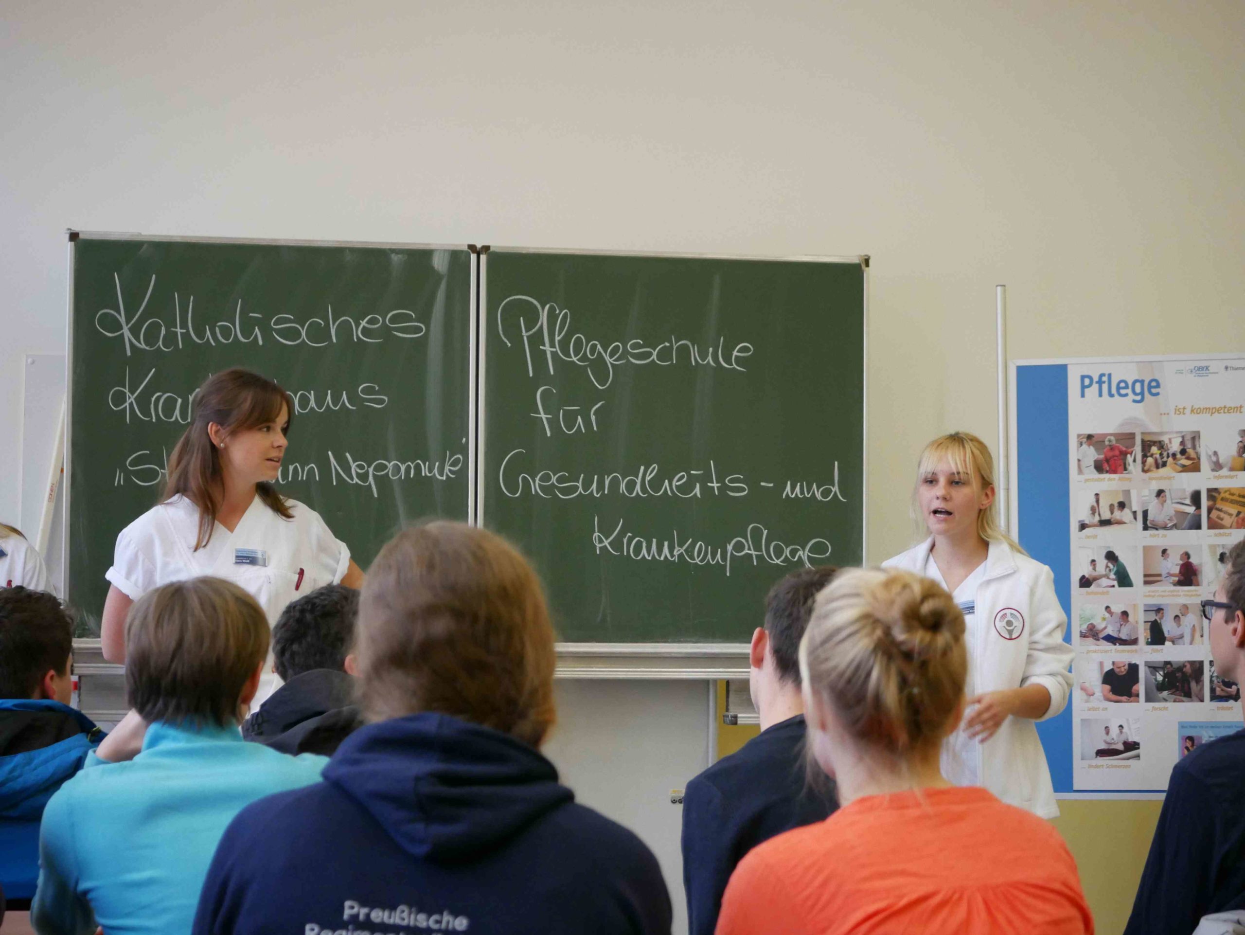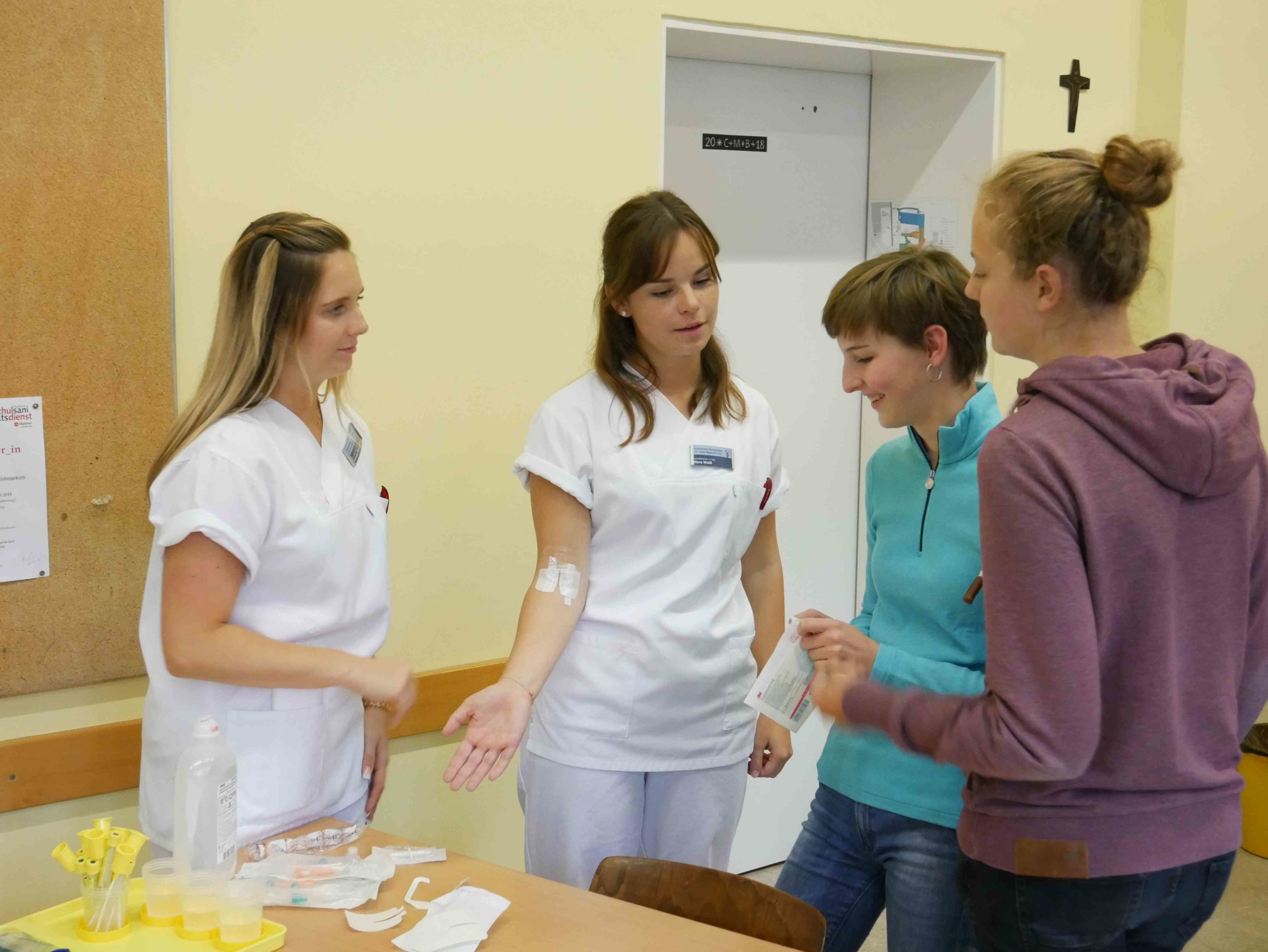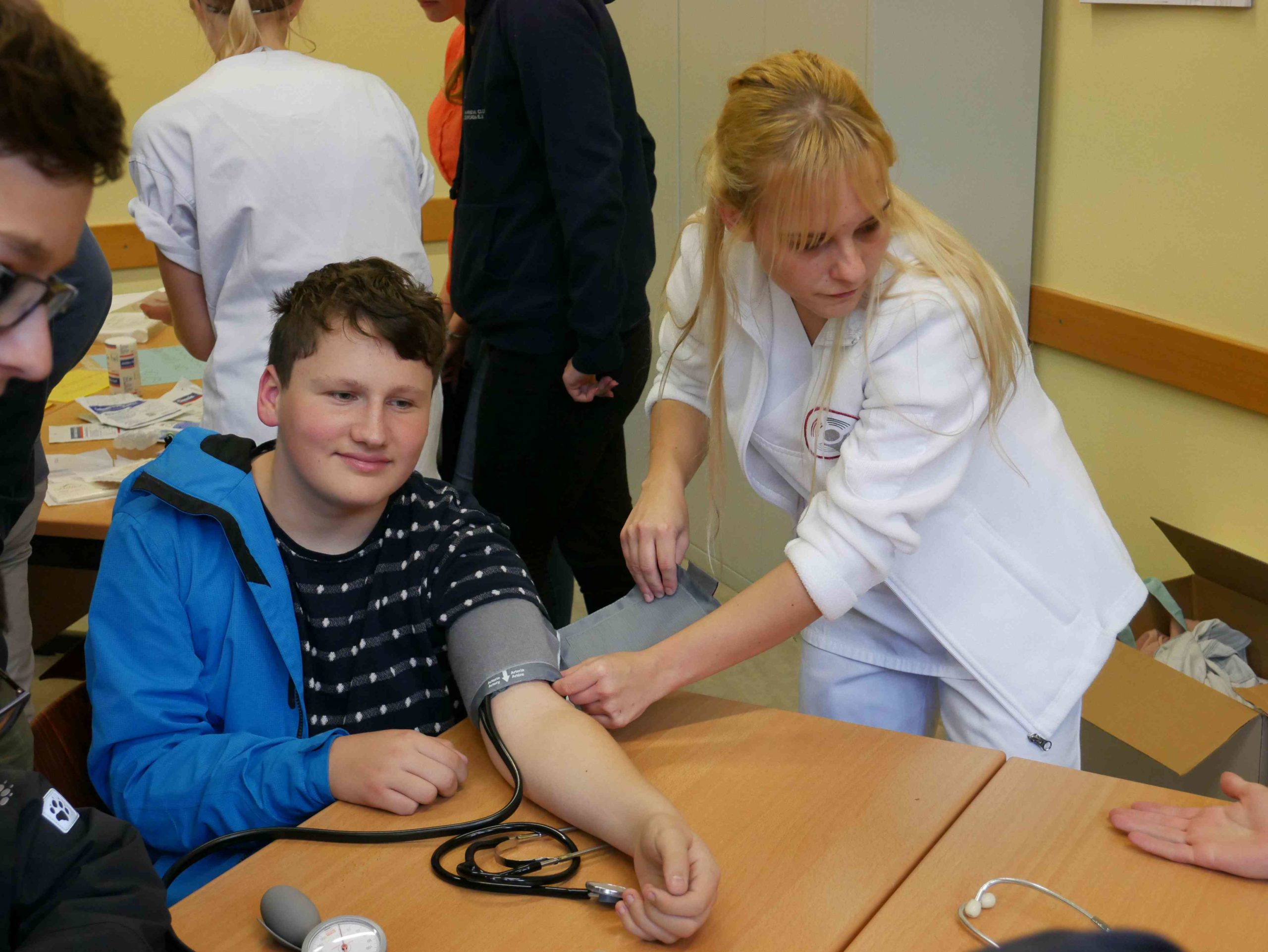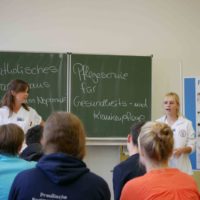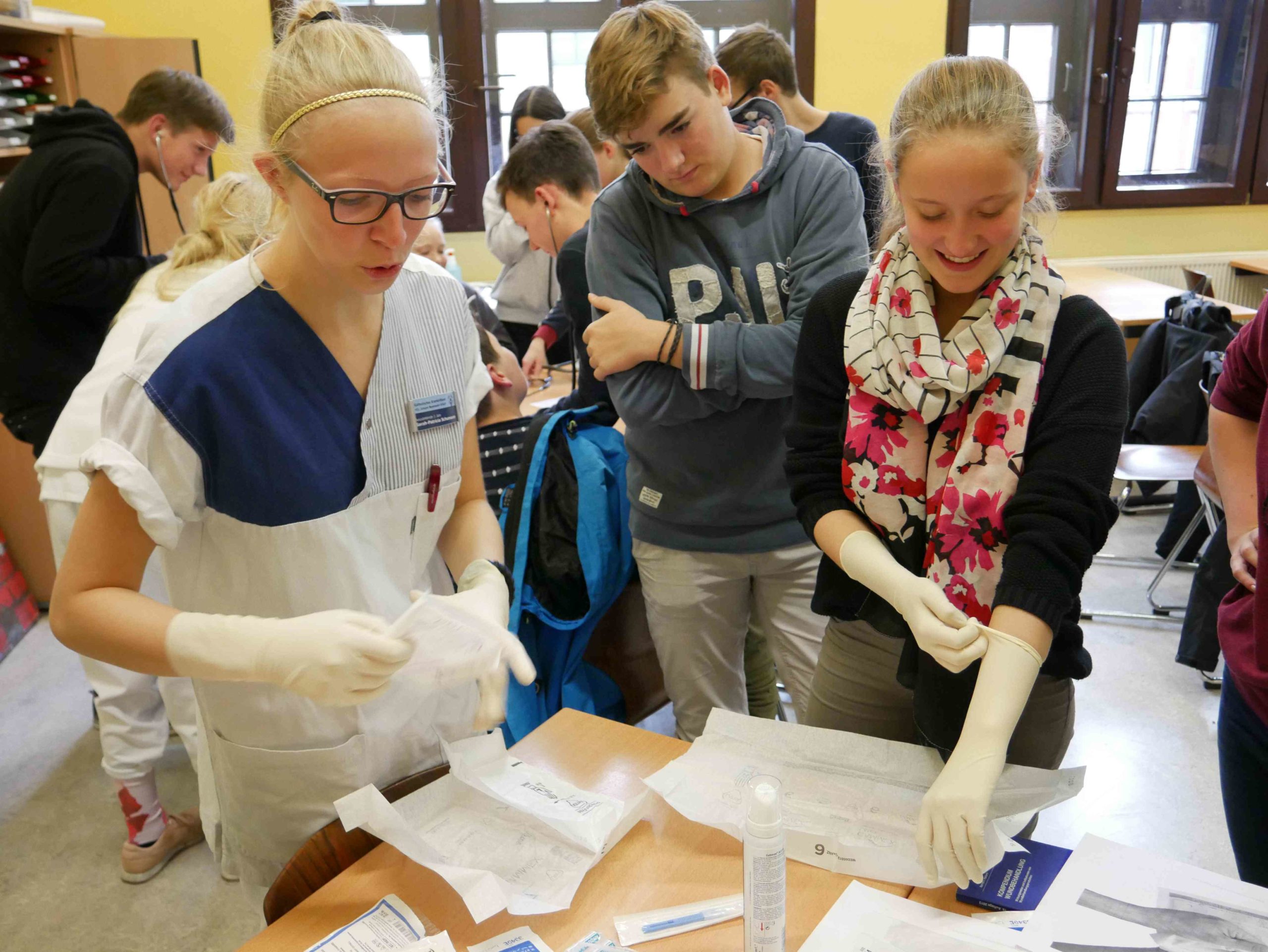 Nach einer kurzen Vorstellungsrunde im Foyer der Schule konnten sich die Schüler der Klassen 9-11 in zwei Blöcken auf die zehn Angebote verteilen und sich genauer informieren. Dabei ging es einerseits um die Abläufe eines Freiwilligen Sozialen Jahres (FSJ) oder die Rahmenbedingungen des Bundesfreiwilligendienstes an den jeweiligen Stellen. Des Weiteren gab es detaillierte Einblicke über die Ausbildungs- oder Studienbedingungen, sei es im Bereich der Kranken- oder Altenpflege, beim Rettungsdienst oder der Journalistenschule und der Theologischen Fakultät der Uni. Neben den Informationen zu den theoretischen Abläufen hatten die Schüler dabei auch die Gelegenheit, praktische Erfahrungen zu sammeln. Vor allem die persönlichen Eindrücke und Motive der jeweiligen Vertreter, egal ob Azubi, Chefarzt oder Seelsorgerin, waren dabei sehr einprägend.