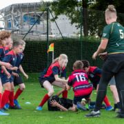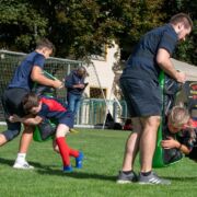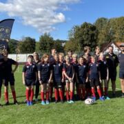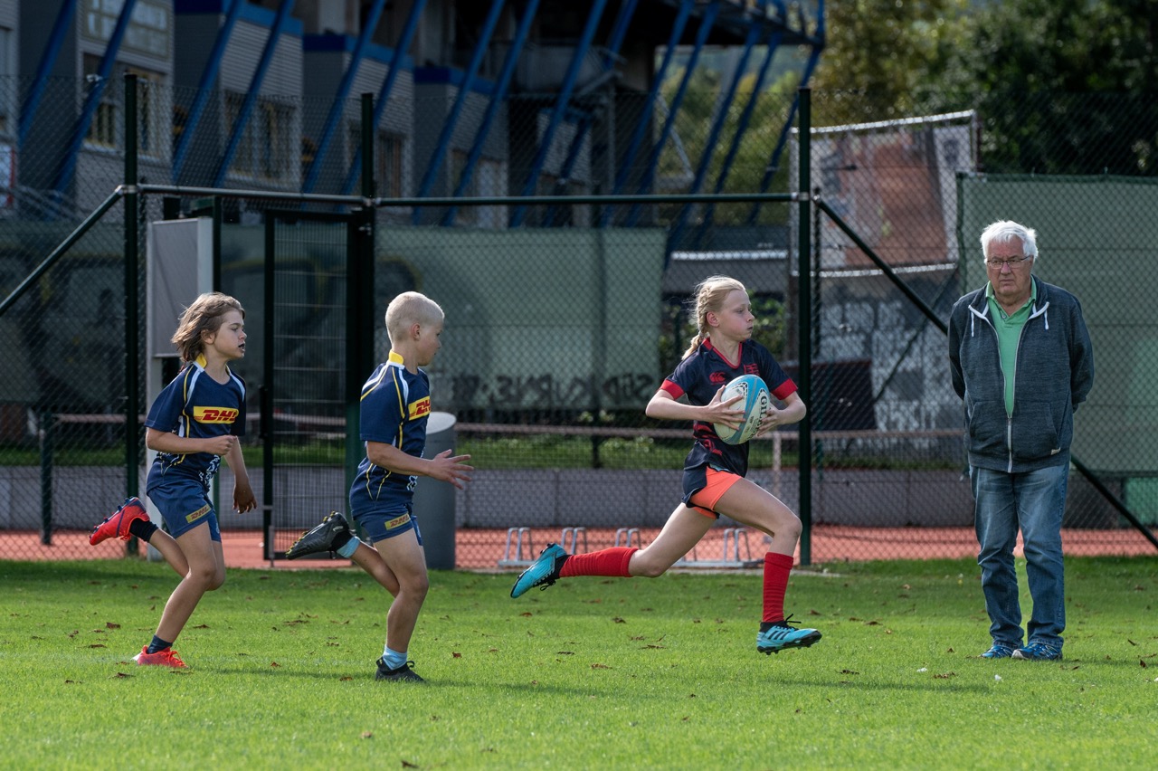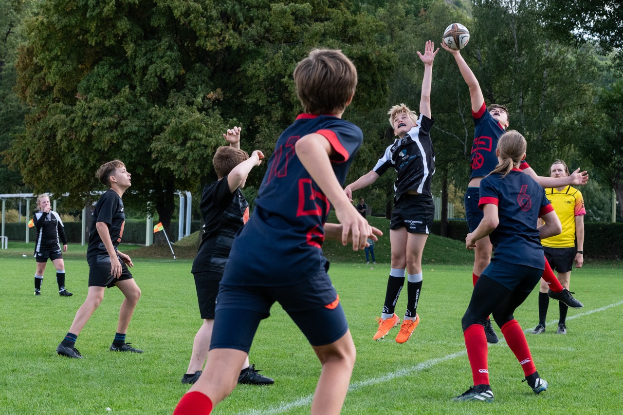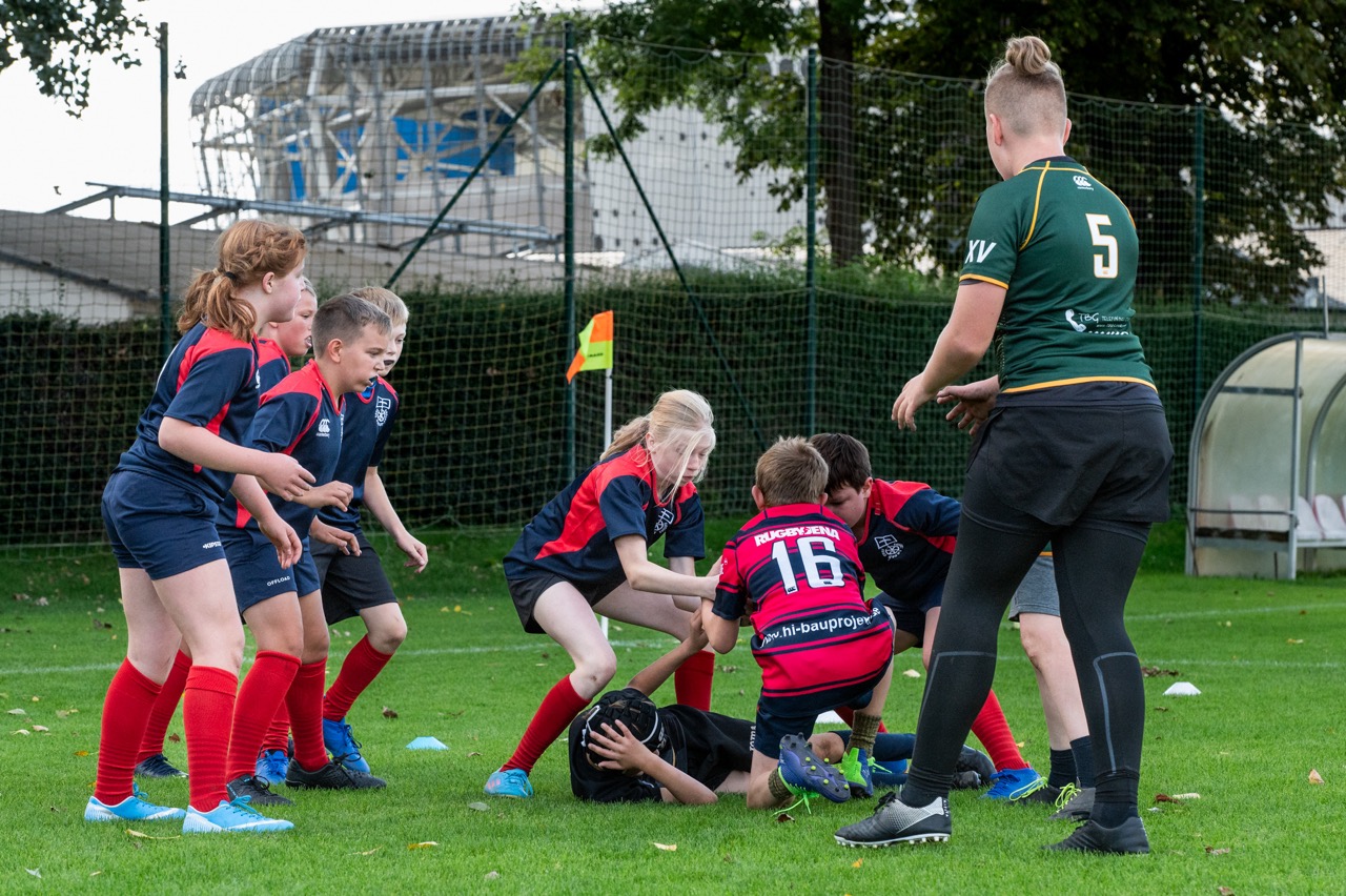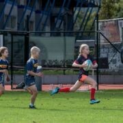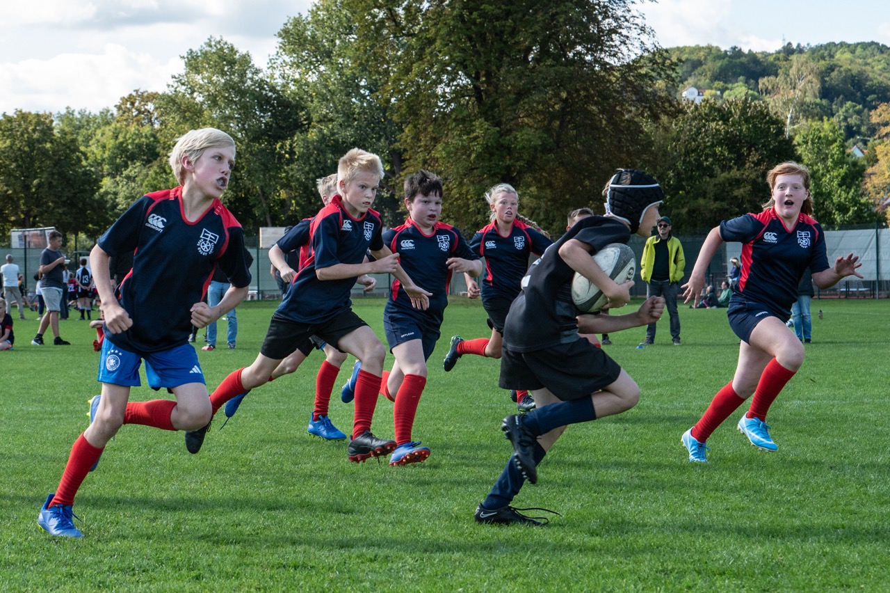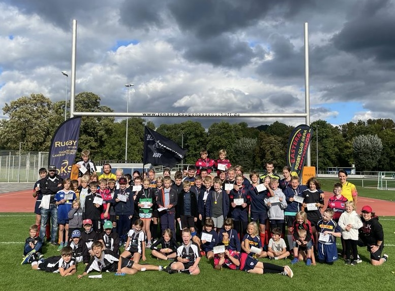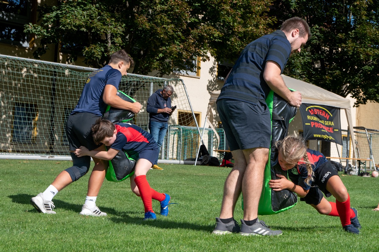 Apropos U14, auch unser Nachwuchs in dieser Altersklasse überzeugte am Samstag beim Turnier der Mitteldeutschen 7er Nachwuchsliga in Jena und gewann seine beiden Spiele souverän. Nachdem Anfang September auch das Auftaktturnier in Leipzig gewonnen wurde, stellt die U14 schon jetzt die Weichen für eine erfolgreiche Verteidigung des Meistertitels, obwohl einige Spieler in die U16 abgewandert sind und das Team durch aufgerückte U12er deutlich verjüngt wurde. Die U12 ihrerseits sammelte beim gleichen Turnier und ihrer Saisonpremiere weiter Erfahrung und auch einige Punkte für die Ligatabelle. Obwohl beide Spiele verloren wurden, traten sie als einziges komplettes Team an und erhalten dafür die volle Punktzahl für die Turnierplatzierung, wohingegen sich die Spielgemeinschaften aus Gera, Jena, Halle und Leipzig die Punkte teilen müssen. Das Trainergespann Kräling/Wiltzsch sieht den Neuaufbau des Teams weiter als gut anlaufendes Projekt, wächst doch die U10/U12 Trainingsgruppe stetig an. So konnten gleich mehrere Spieler*innen am Samstag ihr Debut feiern und freuten sich über gelungene Tackles und sogar die ersten Versuche.