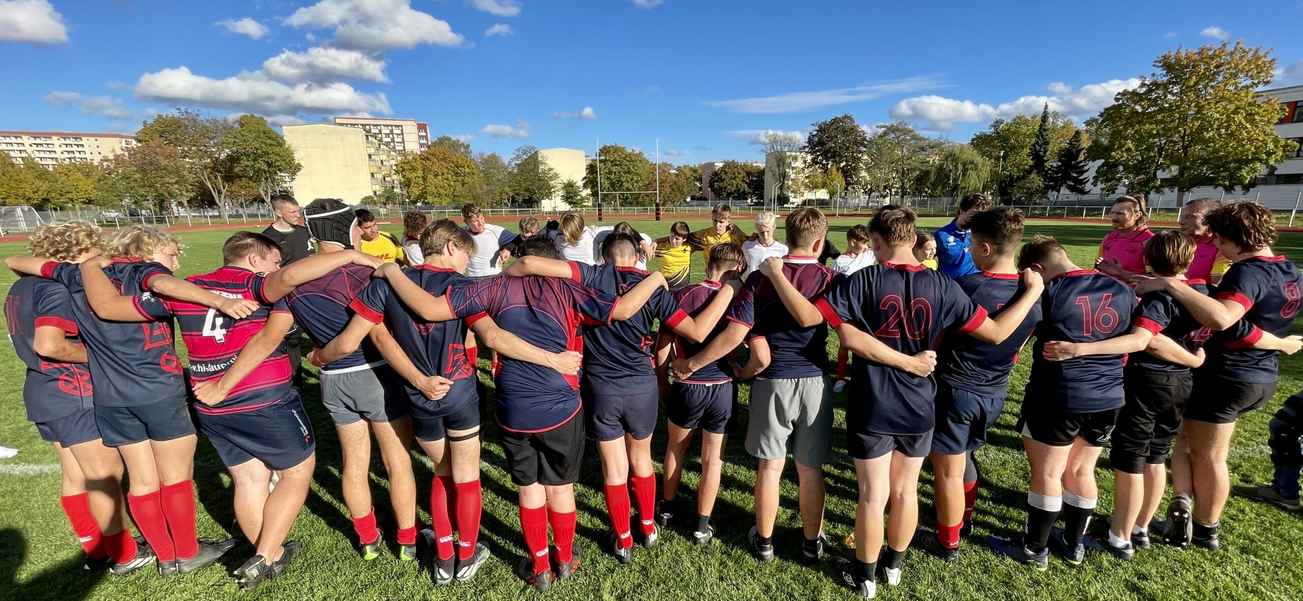 Am Halbfinalwochenende der zur Zeit in Frankreich laufenden Rugby Weltmeisterschaft konnten unsere Teams beim Heimturnier der Mitteldeutschen 7er Nachwuchsliga glänzen. Spieler*innen von 8 Vereinen kamen bei perfekten Rahmenbedingungen am Sportplatz in der Essener Straße zusammen und so konnten von der U10 bis zur U14 jeweils drei Mannschaften und Spielgemeinschaften eine Turnierrunde ausspielen. Zusätzlich gab es sogar bei der U8 zwei Spiele im Tag-Rugby Format ohne Kontakt, so das unsere beiden Jüngsten auch zu ihrem ersten Spieleinsatz kamen. Hier gab es nicht nur aufgrund der beiden Unentschieden ausschließlich Sieger.