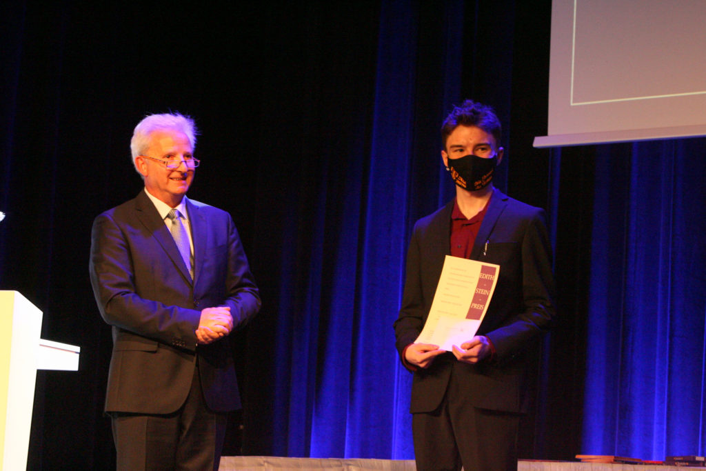 Eine weitere Würdigung für besonderes Engagement erfuhr zu späterer Stunde Jakob Holleczek während des Abidinners. Er erhielt für seine jahrelangen Mühen in der Multi-Media AG sowie die vielfache eigenständige Unterstützung der medienkundlichen Ausbildung an unserer Schule bei Projekttagen und Medienkundefortbildungen den Edith-Stein-Preis des Fördervereins der ESS.