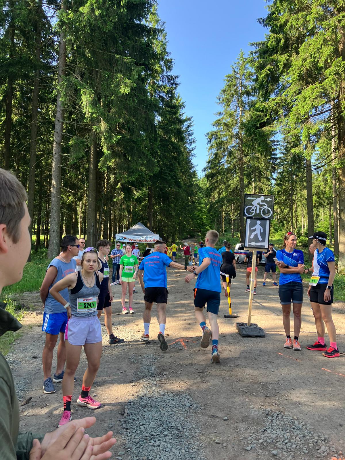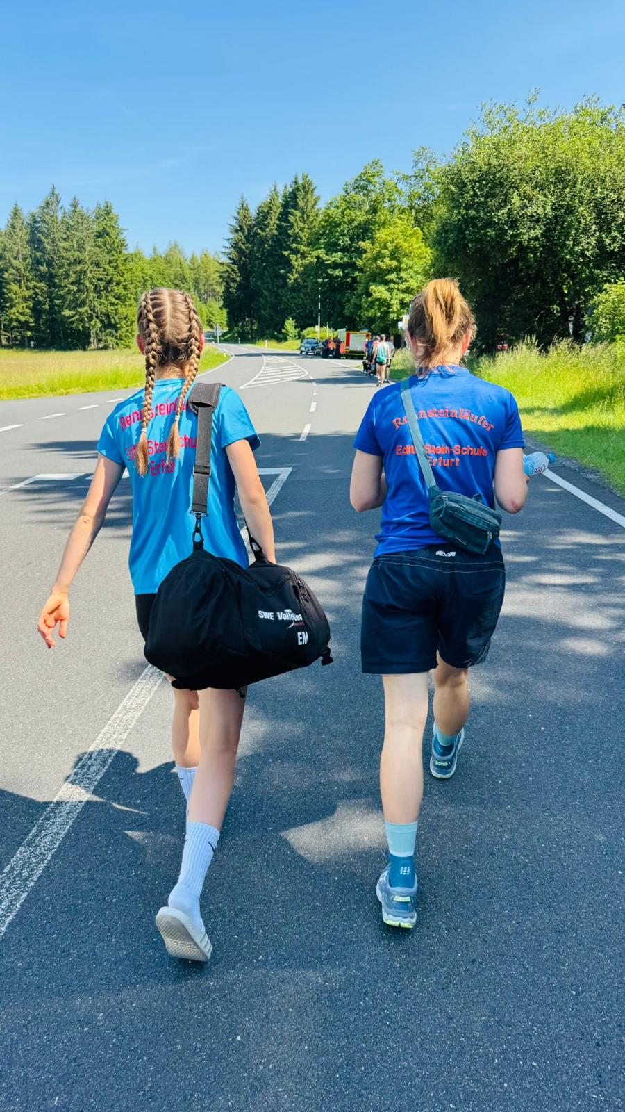 5:00 Uhr Start!!! Katja kämpft sich einen langen Anstieg hinauf auf den Rennsteig. Der erste Wechsel zeigt schon, wir sind nicht allein. Den ganzen Tag über fröhliche und bekannte Gesichter ehemaliger SchülerInnen, die meisten von ihnen waren RENNSTEINLÄUFER. Es werden aktuelle persönliche Situationen besprochen, über Anekdoten gelacht „…weißt du noch als…“, Tipps zur besten Bratwurst des Rennsteigs gegeben und Pläne geschmiedet. Es ist wie immer außergewöhnlich; außergewöhnlich anstrengend (Hitze und Wind), außergewöhnlich lang (die Strecken zwischen 14 und 21 Kilometer) und man ist außergewöhnlich zusammen unterwegs. Ein Team, ein Ziel und mehr als 11 brennende Herzen. Vielen Dank für die Unterstützung der jeweiligen Familien, Eltern, Laufbegeisterten und des Edith-Stein-Schulsportvereins `98 e.V.. Wir wissen das sehr zu schätzen!!!
