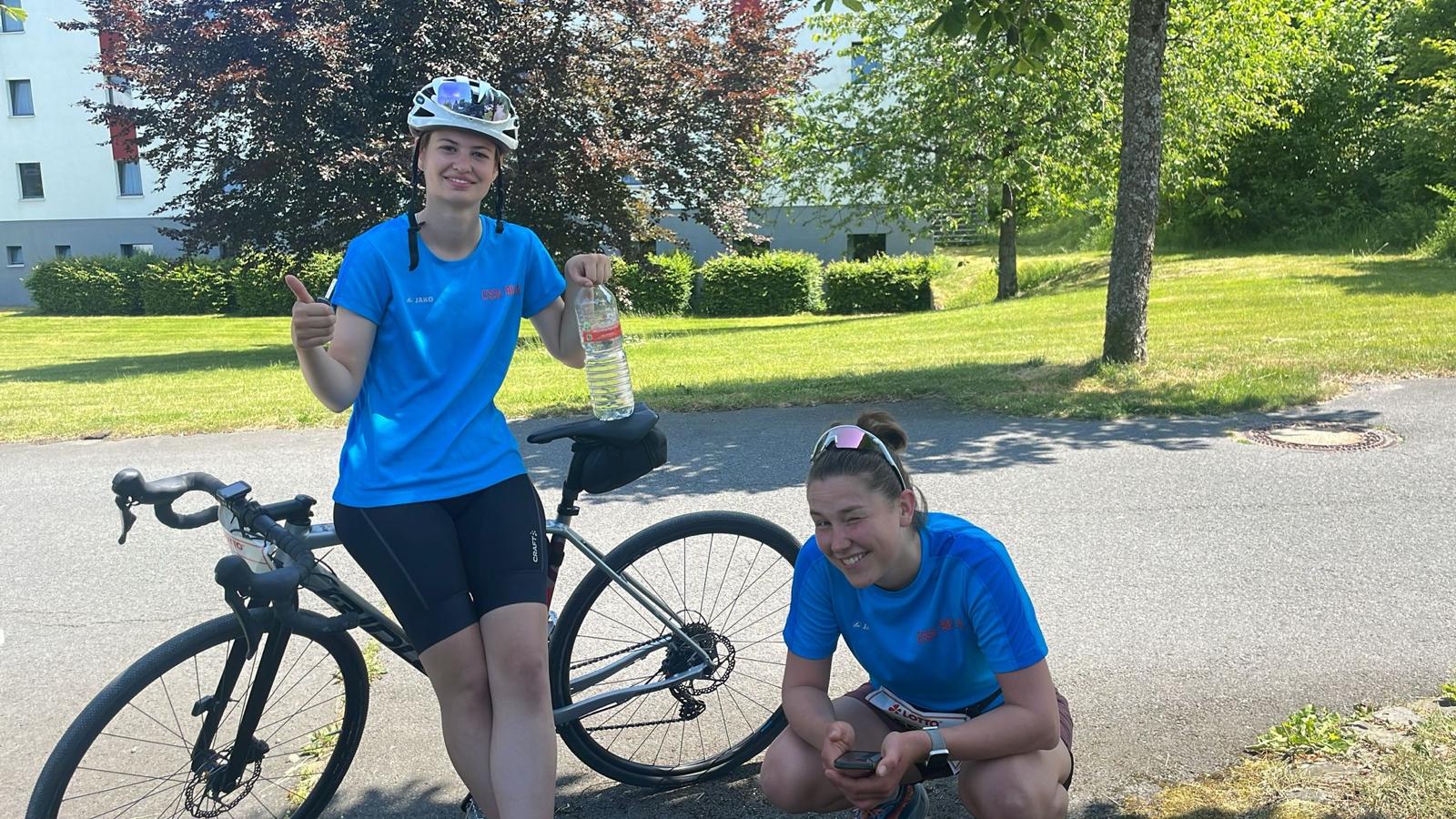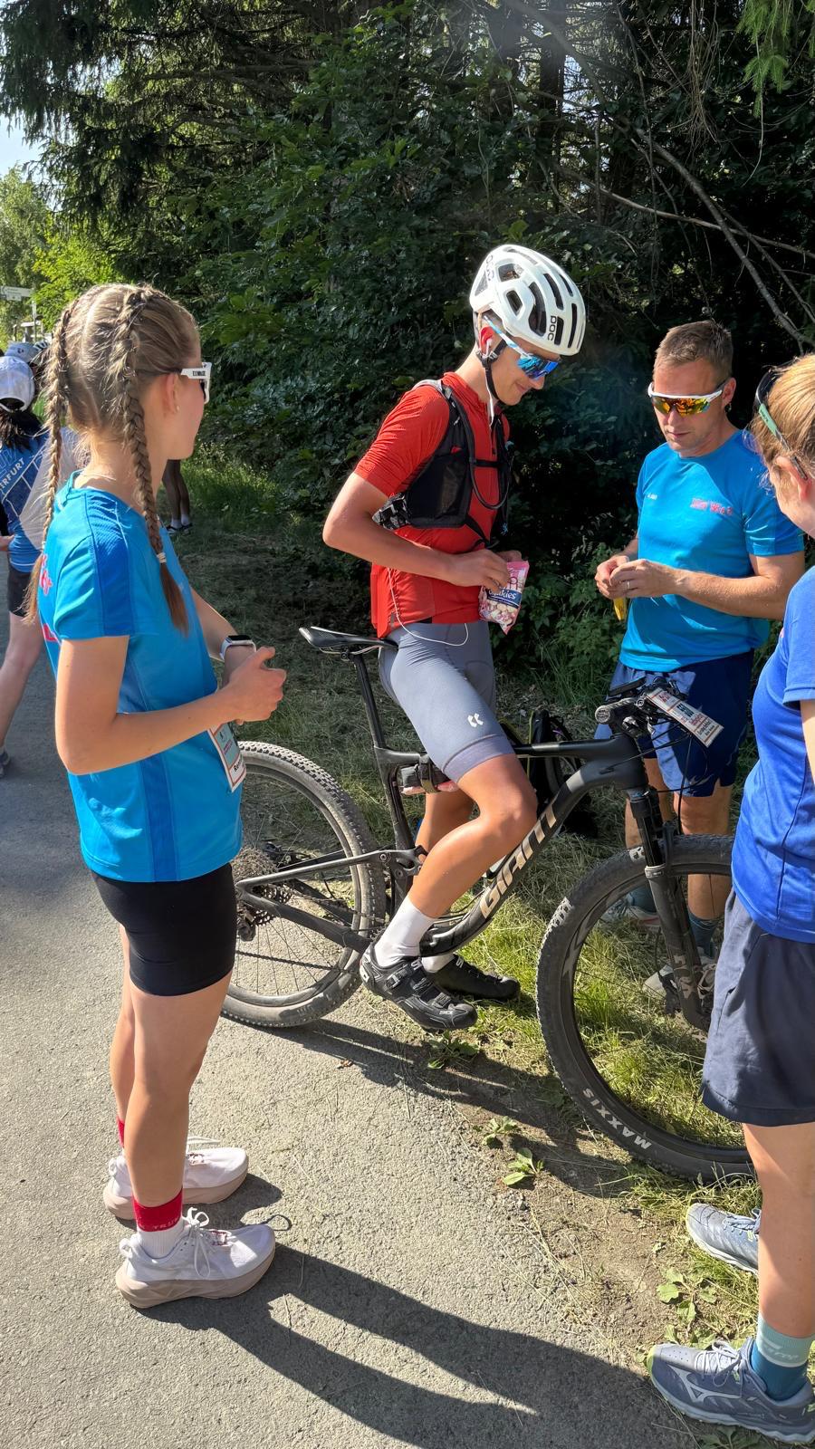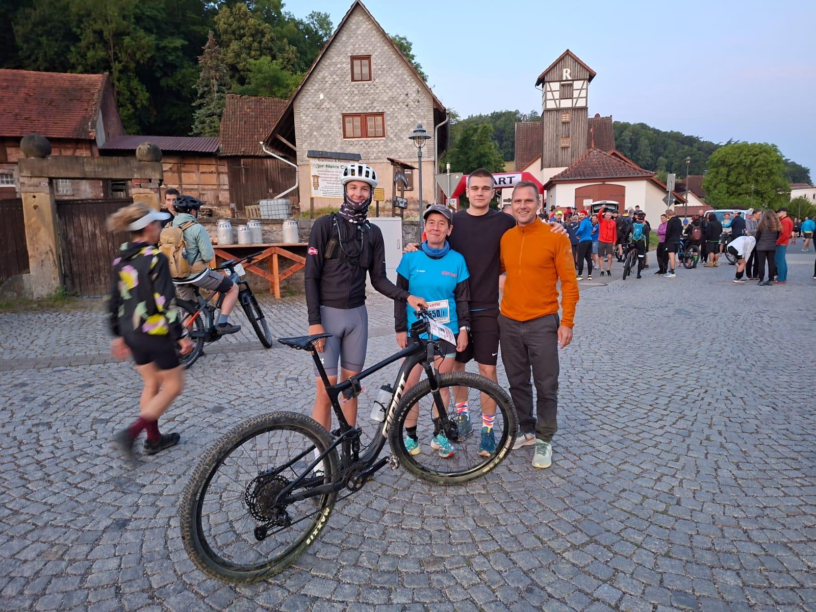 Mittlerweile ist es 2:45 Uhr und am „Kaffeetrichter“ stehen pünktlich und hochmotiviert die ersten Einsatzkräfte des Tages bereit zur Abfahrt. Katja, Tim und Luis beladen den Bus und auf geht es nach Blankenstein. Im Morgengrauen wird der Transponder zur Zeitmessung aktiviert ein traditioneller Staffelstein gesucht (dieser muss die gesamte Strecke mitgeführt werden) und Luis sichtet und erklärt die Inhalte seines bis zum Platzen gepackten Rucksacks. Gels jedweder Couleur, Carb-Drinks, Stilles Wasser, Riegel und eine große Tüte Gummibärchen sind Inhalt seiner Wundertüte. Er wird es brauchen, schließlich ist er mal ein stiller, mal ein lauter, aber immer ein hilfreicher Laufbegleiter auf dem Rad über 15 Stunden lang.
