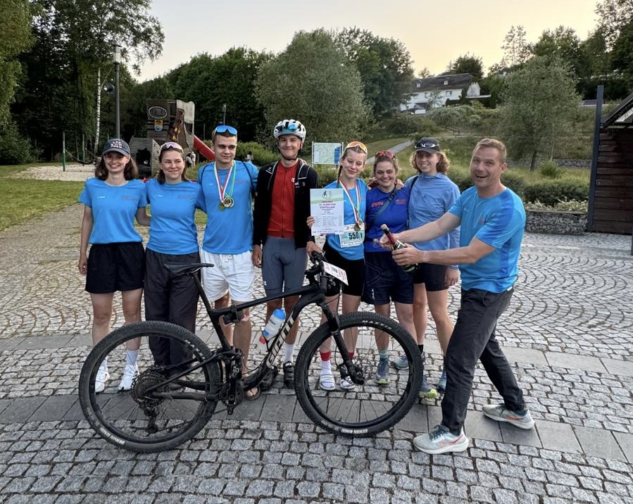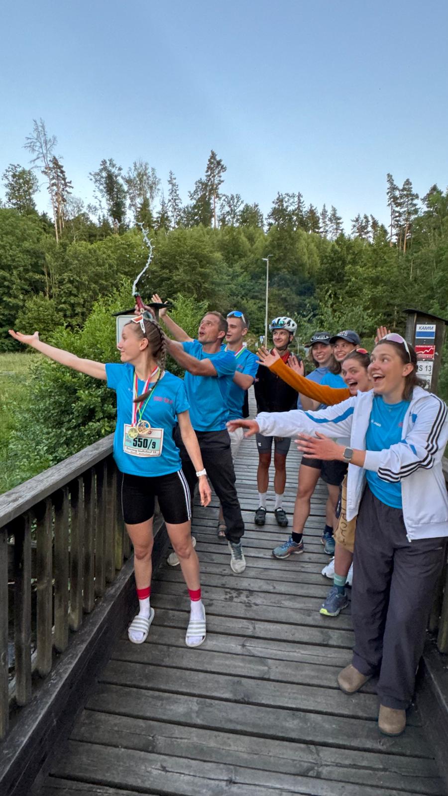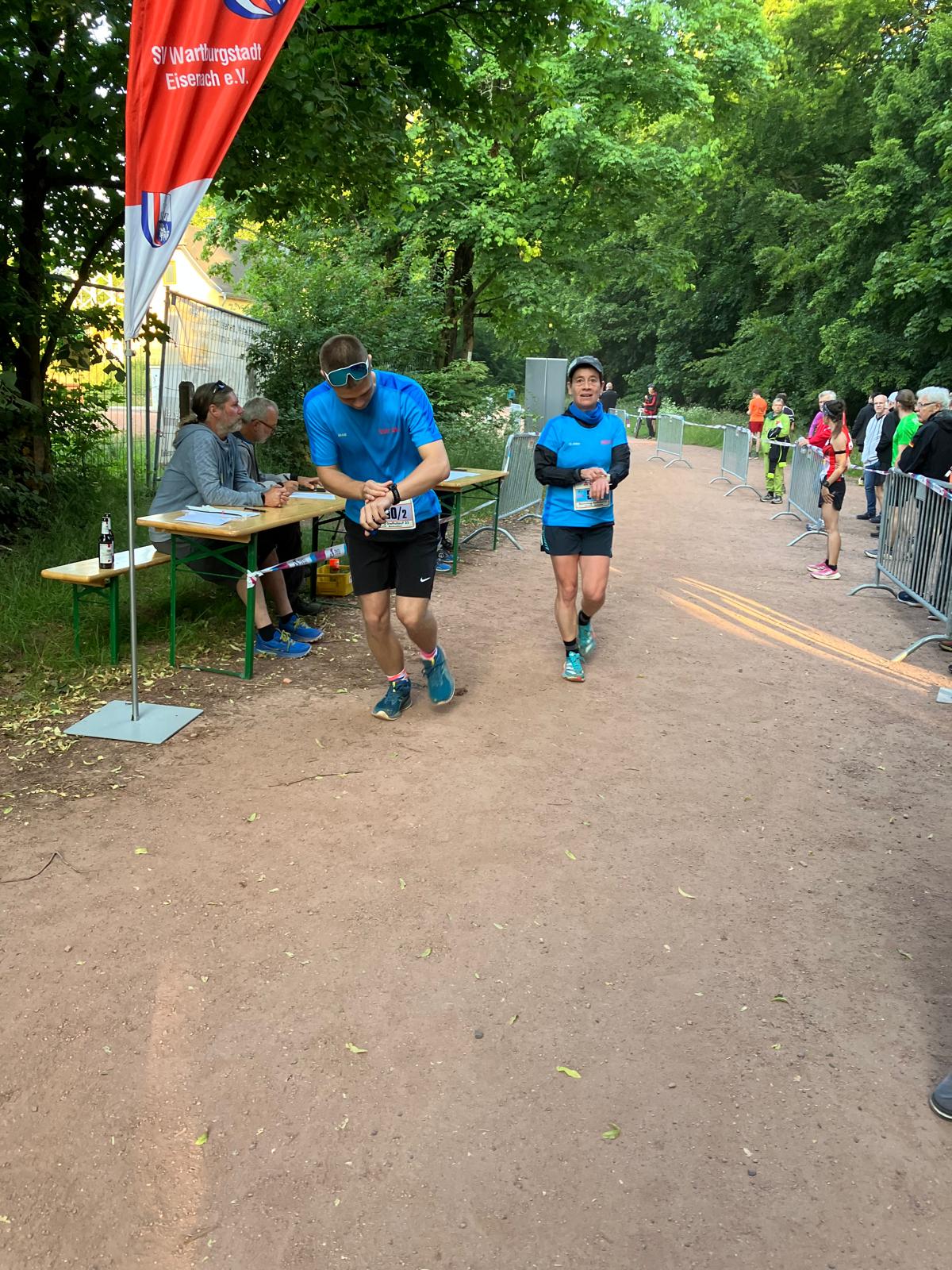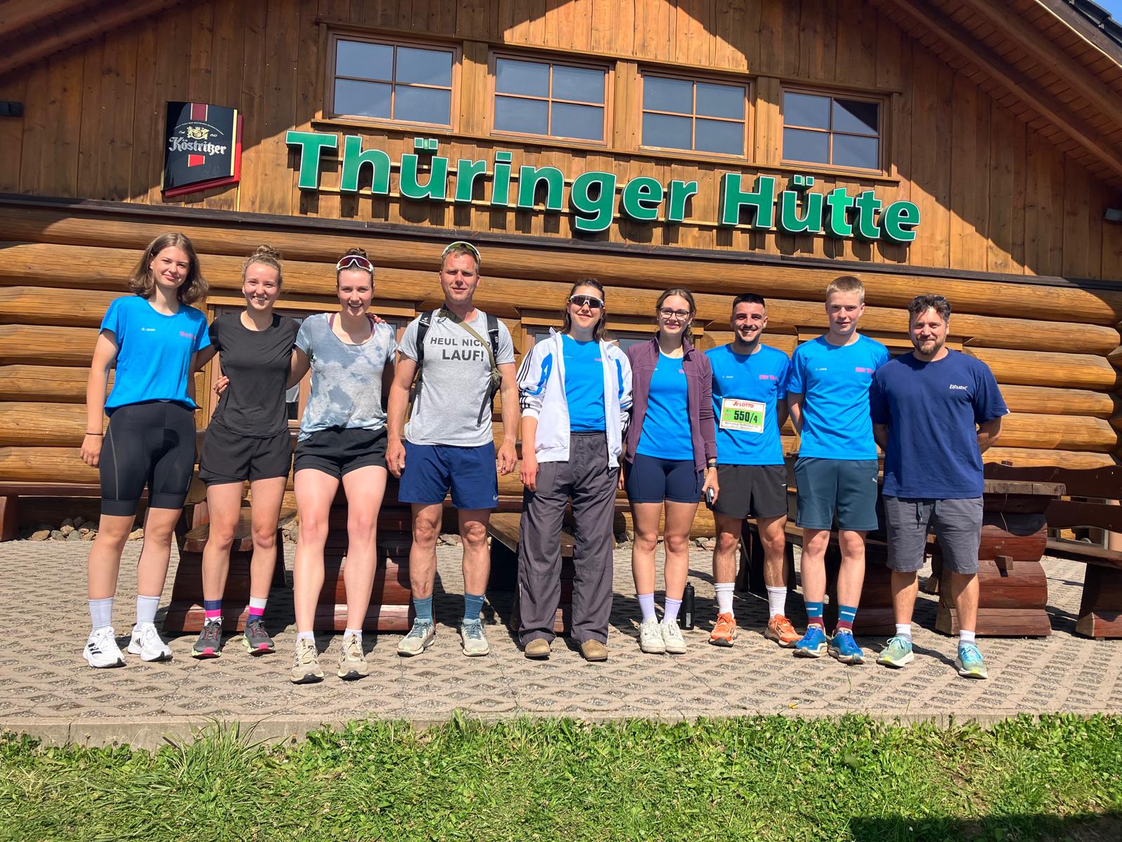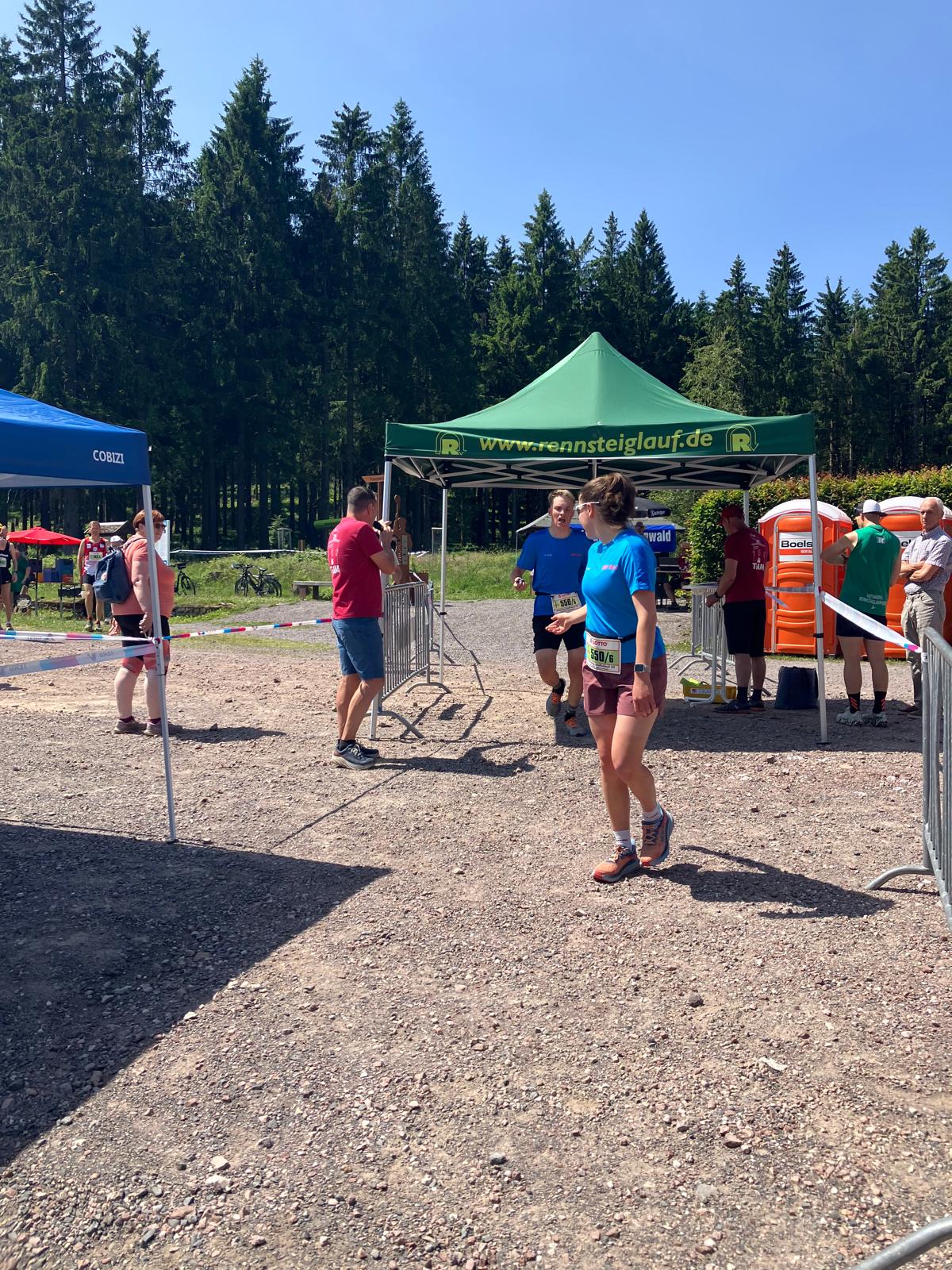 Der Zielsprecher ruft durch das Mikrophon: „Die Staffel 550; „Rennsteinläufer“ sind im Anmarsch!“ Schon biegt Luis auf dem Rad um die Ecke. Alle bilden nun eine Traube und laufen ein letztes Mal voller Stolz, erschöpft aber überglücklich nach 15 Stunden 20 Minuten und 30 Sekunden ZUSAMMEN durch den Torbogen und über die Ziellinie.