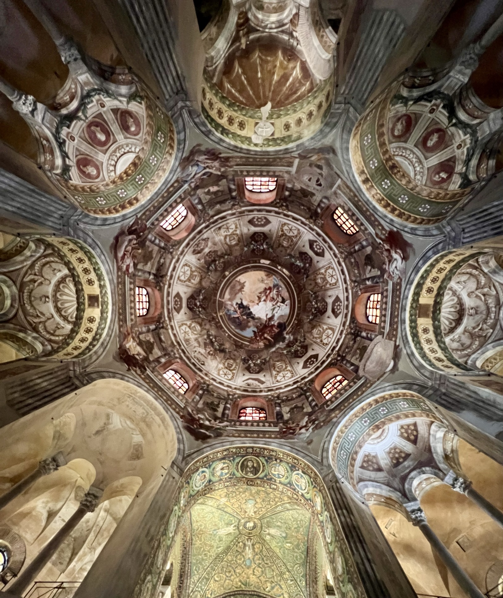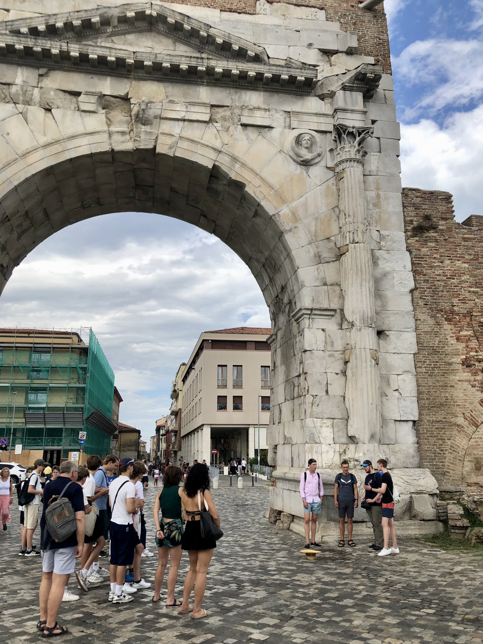 Giorno 4 – 30 agosto 2023 Ravenna, die Stadt mit den schönsten Mosaiken der Welt und mehrfaches Weltkulturerbe war das vorletzte Ziel unserer Reise. Wir besichtigten die Basilika und ehemalige Palastkirche Theoderichs  Sant‘Apollinare Nuovo mit dem Porträt Justinians, den Magi und dem Zug der Heiligen. Anschließend ging es von Nationaldichter  Dantes Grabmal aus zur unglaublich alten byzantinischen Basilika San Vitale mit ihrer außergewöhnlichen Form. Wir bewunderten die prächtigen Mosaikdekorationen der Apsis und die wunderschönen Fresken und das Fußbodenlabyrinth. Unsere Freizeit nutzten wir, um das Zentrum der kleinen norditalienischen Stadt zu erkunden. Zum Abschluss unseres Ravenna-Aufenthaltes gönnten wir uns ein überaus köstliches „Gelato due giusti“. Zurück in Rimini ging es an den Strand – das schöne Wetter, das warme Wasser und die besonders großen Wellen luden zum Baden ein.