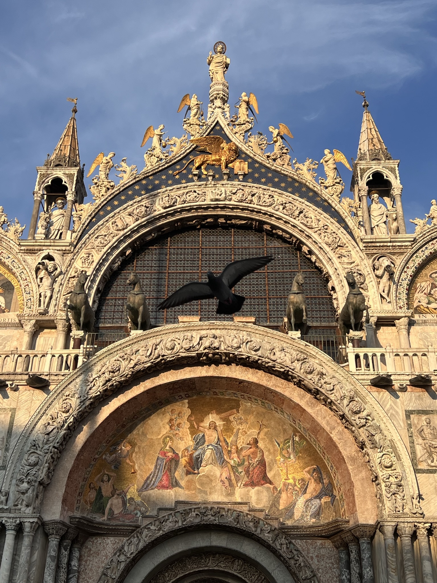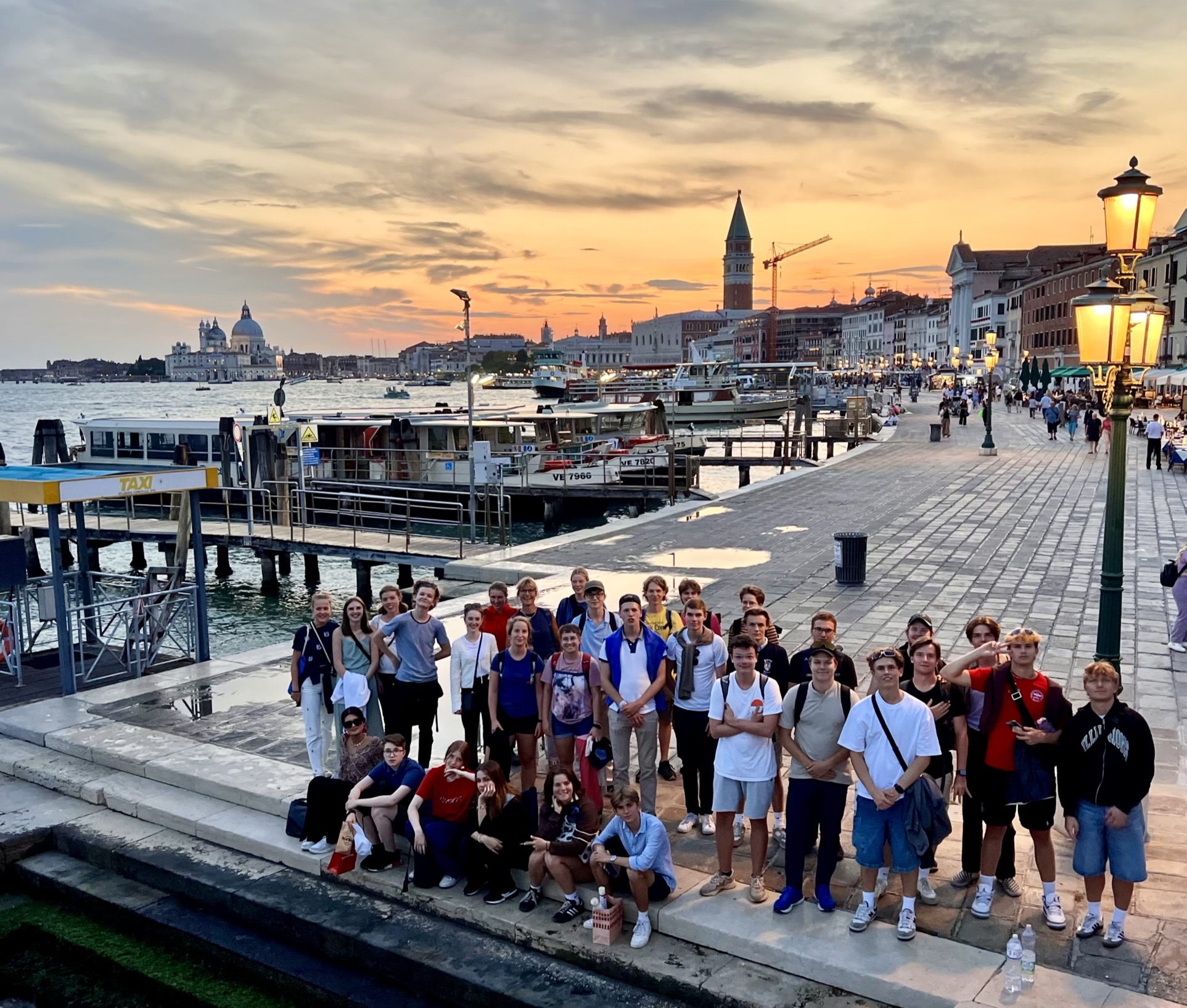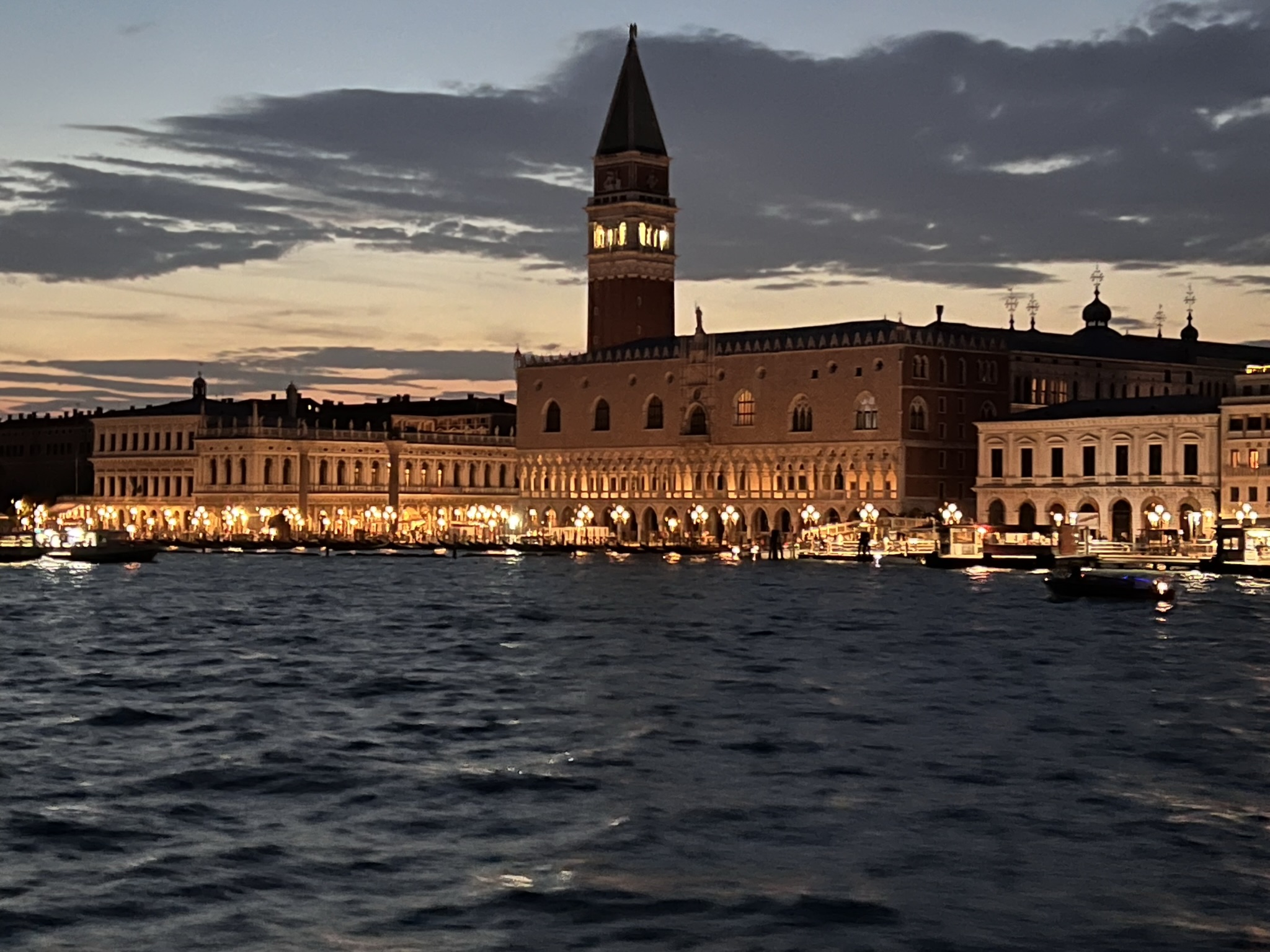 Giorno 5 – 31 agosto 2023 „Buongiorno, Venezia!“ – wir kommen. Bei Sonnenschein und angenehmen Temperaturen fuhren wir von Tronchetto aus mit dem Boot an die Uferpromenade Riva degli Schiavoni  im Stadtzentrum Venedigs. Die Stadt war gezeichnet von den starken Regenfällen der letzten Tage – überall stand das Wasser und große Pfützen waren zu sehen. Wegen schwerer Unwetter musste die Lagunenstadt sogar ihren Hochwasserschutz MOSE aktivieren. Doch dies tat keinen Abbruch – die wunderschöne Stadt mit ihren Sehenswürdigkeiten überwältigte uns. Wir besuchten den bekannten Markusplatz mit Dogenpalast, Markusdom und Markusturm, die berühmte Seufzerbrücke , die Rialtobrücke,san Lorenzo und San Giorgio d. Greci, Arsenale und die Giardini. Wir beobachten Gondolieri, die ihre 10-m- Gondeln mit großem Geschick durch die schmalen Kanäle jonglierten. Und wie sagt man so schön – das Beste kommt zum Schluss. Der Tag endete mit einem atemberaubenden Sonnenuntergang, den wir auf der Rückfahrt nach Tronchetto vom Boot aus genießen konnten – einfach romantisch.