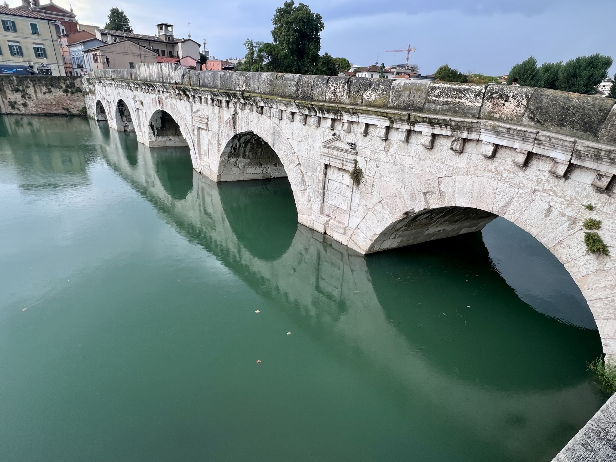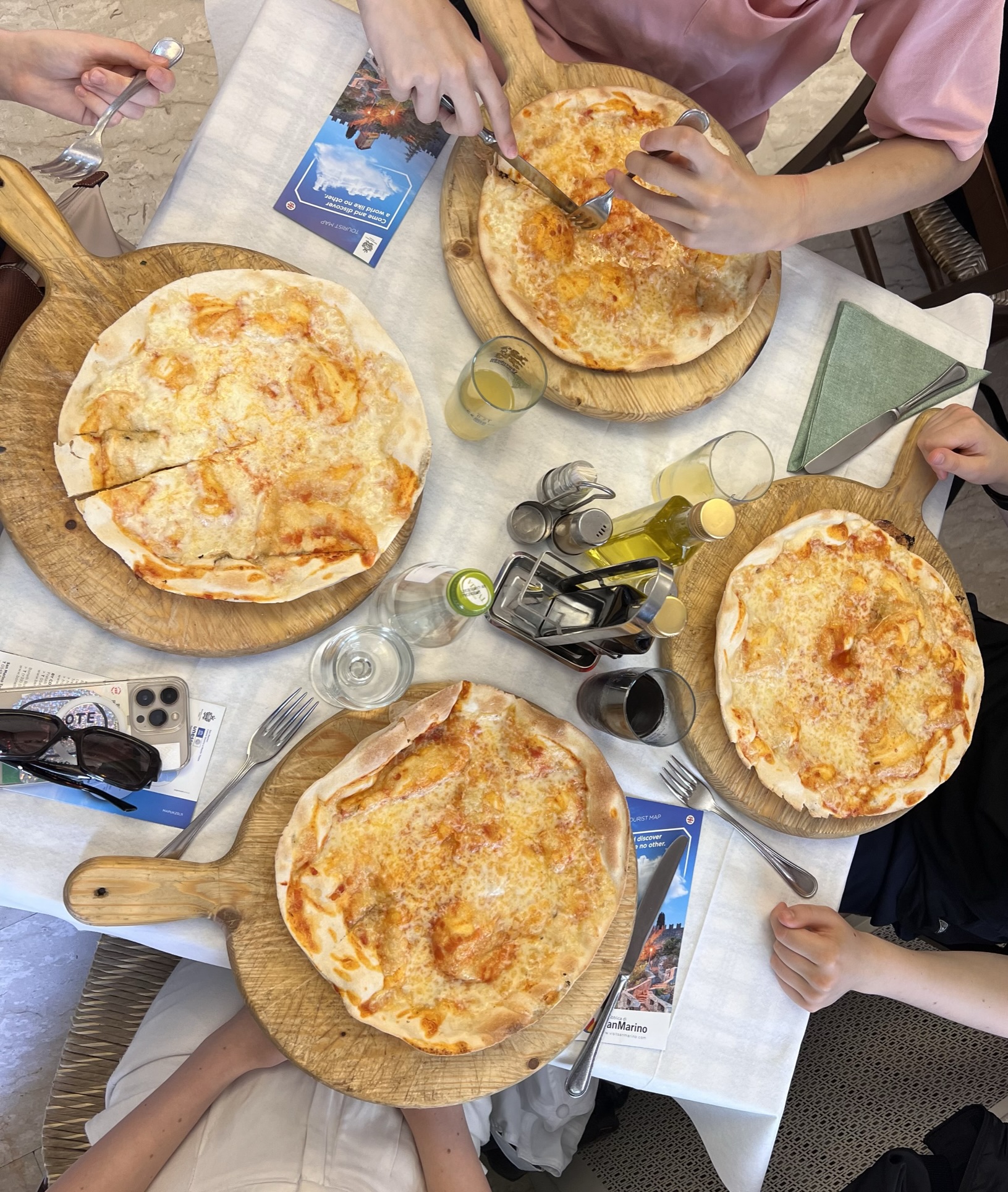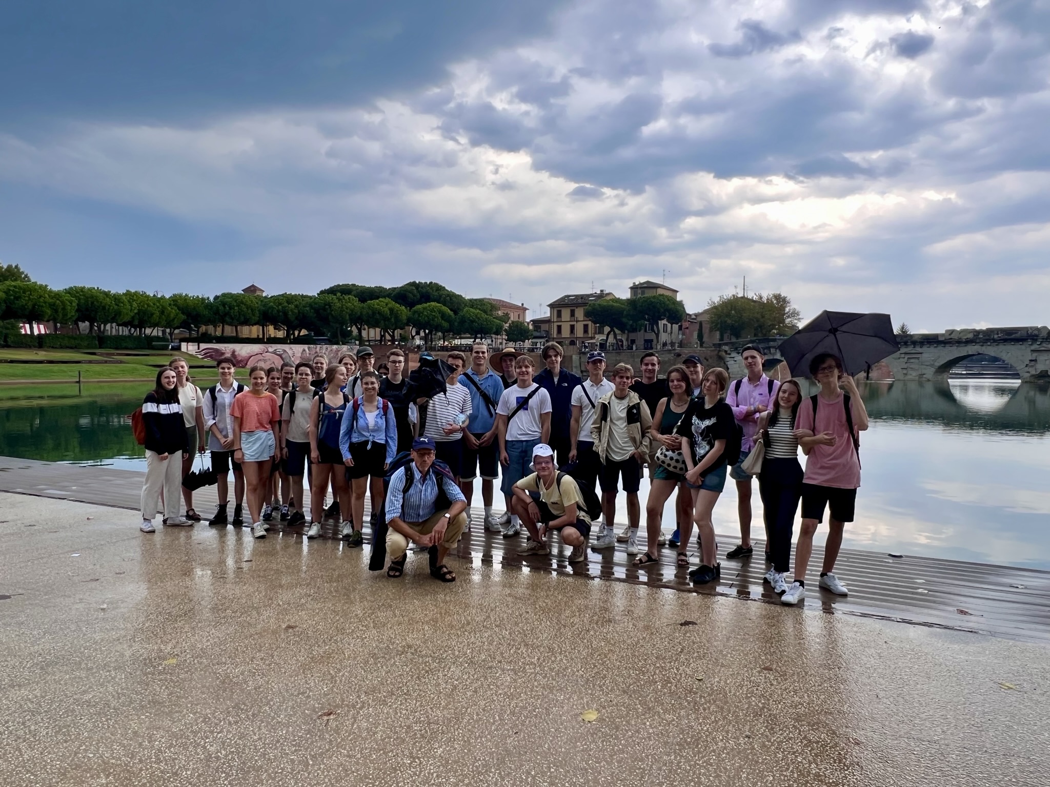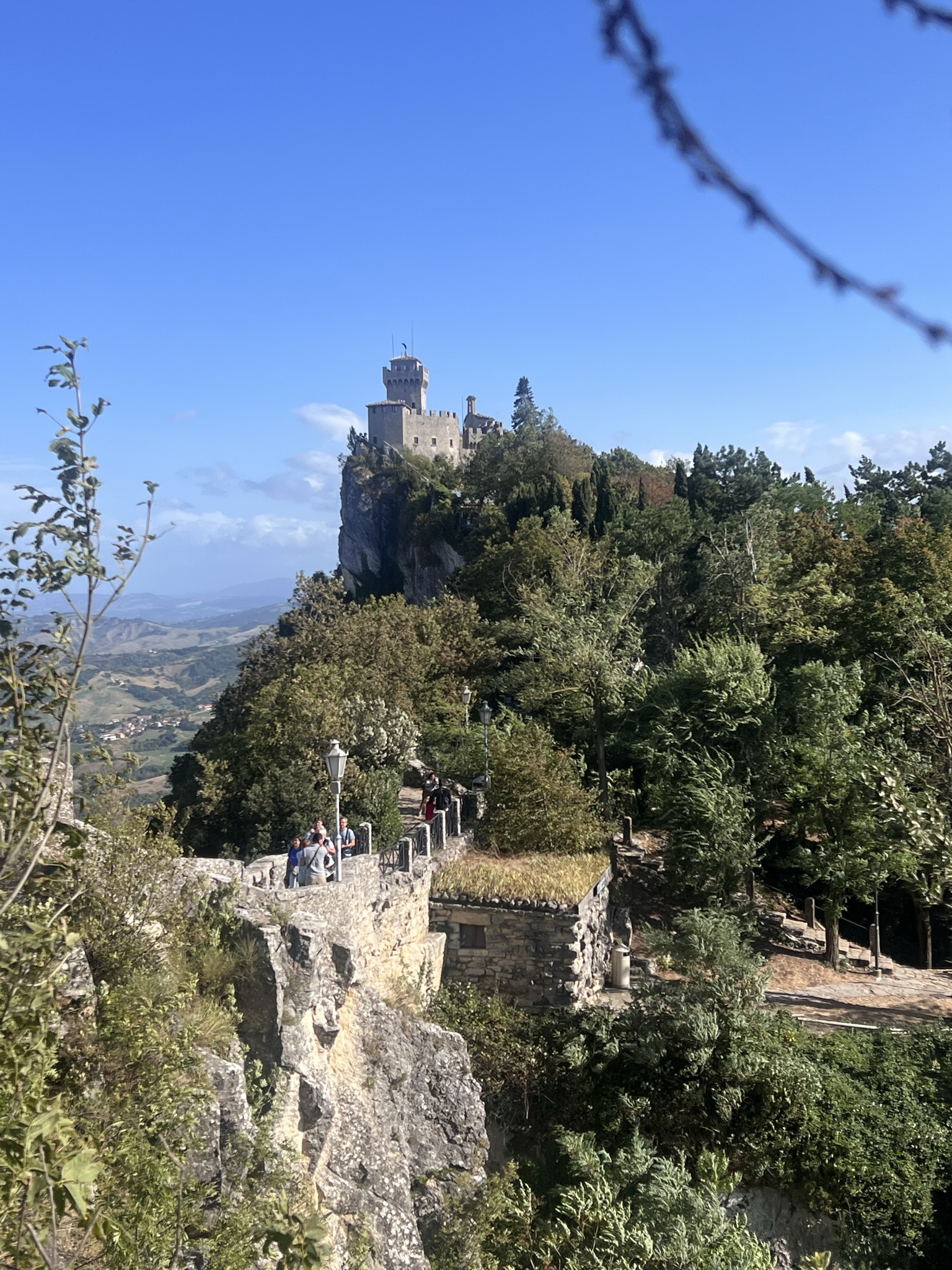 Giorno 2 – 28 agosto 2023 Am zweiten Tag standen Rimini Altstadt und ein Busausflug nach San Marino auf dem Plan. Durch den warmen Regen ließen wir uns nicht abschrecken – ganz im Gegenteil. Mit dem Metromare fuhren wir in das historische Zentrum Riminis. Dort besichtigten wir den Tempio Malatestiano, eine eindrucksvolle Kathedrale, den Augustusbogen  Arco d‘ Augusto, der zu Ehren von Augustus errichtet wurde, die Brücke Ponte di Tiberio und das mittelalterliche Fischerviertel Borgo San Giuliano. Immer wieder wurde deutlich, dass wir ESSler gern singen und das nicht nur auf der Fahrt im Bus. So verdienten sich unsere Jungs mit Straßenmusik in Rimini und Liedern wie zum Beispiel „Veronika, der Lenz ist da“ Anerkennung beim italienischen Publikum und sogar ein paar Euros dazu. Mittags ging es mit dem Reisebus und der Reisebegleiterin Michaela, die uns Geheimtipps verriet und Fragen beantwortete, nach San Marino, um die älteste Republik der Welt zu besichtigen. Wir staunten nicht schlecht, dass San Marino sehr von Waffen geprägt war – fast jedes zweite Geschäft hier war ein Waffengeschäft. In der, laut Aussage Michaelas, besten Pizzeria namens „Bolognese“ verspeisten wir eine köstliche Pizza, um dann gestärkt San Marino zu erkunden.