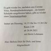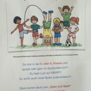 In der letzten Woche starteten viele Arbeitsgemeinschaften und Sportangebote an der Edith-Stein-Schule. Auch in der nächsten Woche fangen noch neue interessante Beschäftigungsmöglichkeiten an. So hat der Schulsportverein seine Trainingszeitenplan aktualisiert und es kann überall noch eingestiegen werden. Hier findet ihr ein Übersicht mit allen Zeiten und Möglichkeiten.