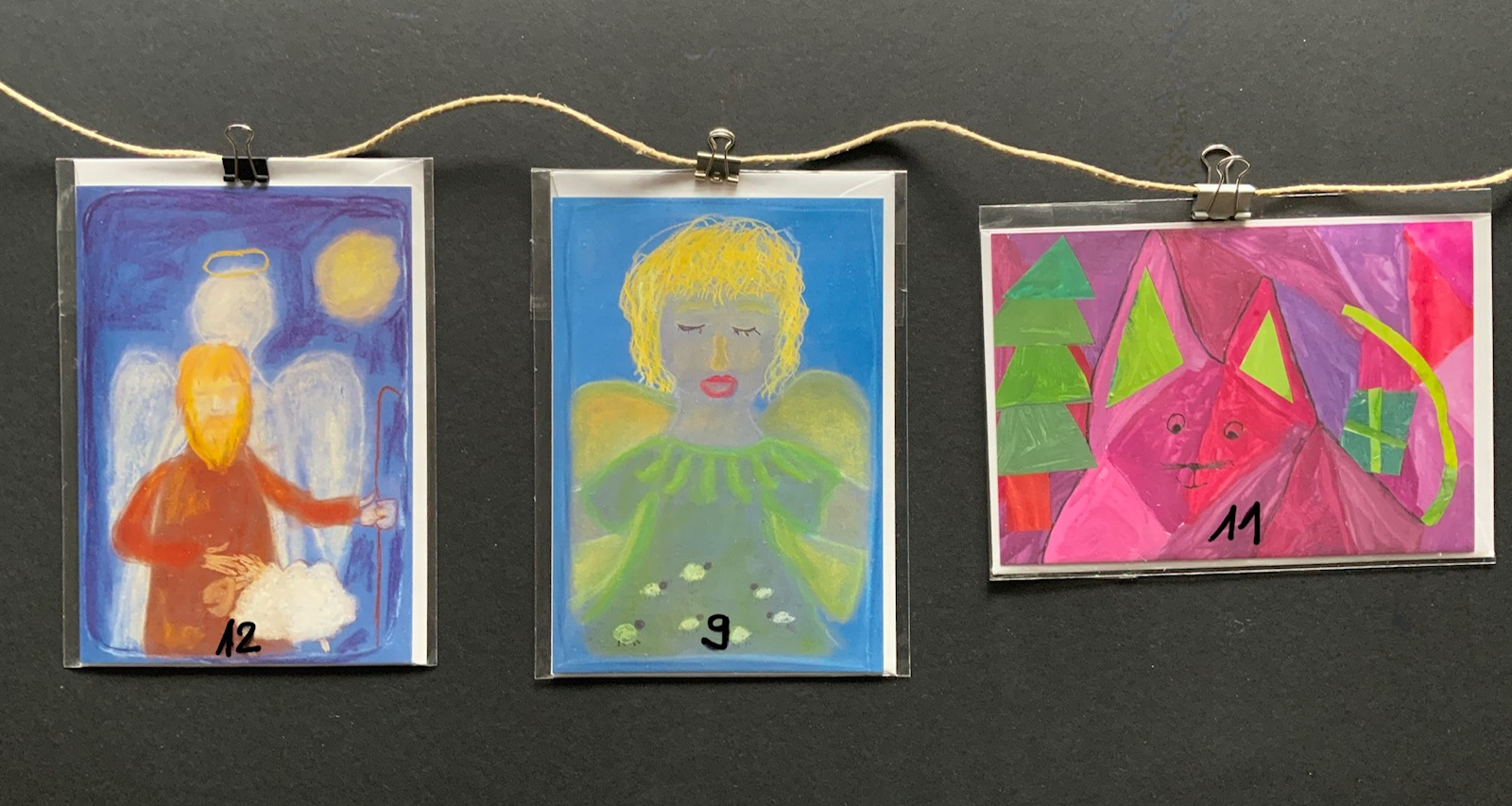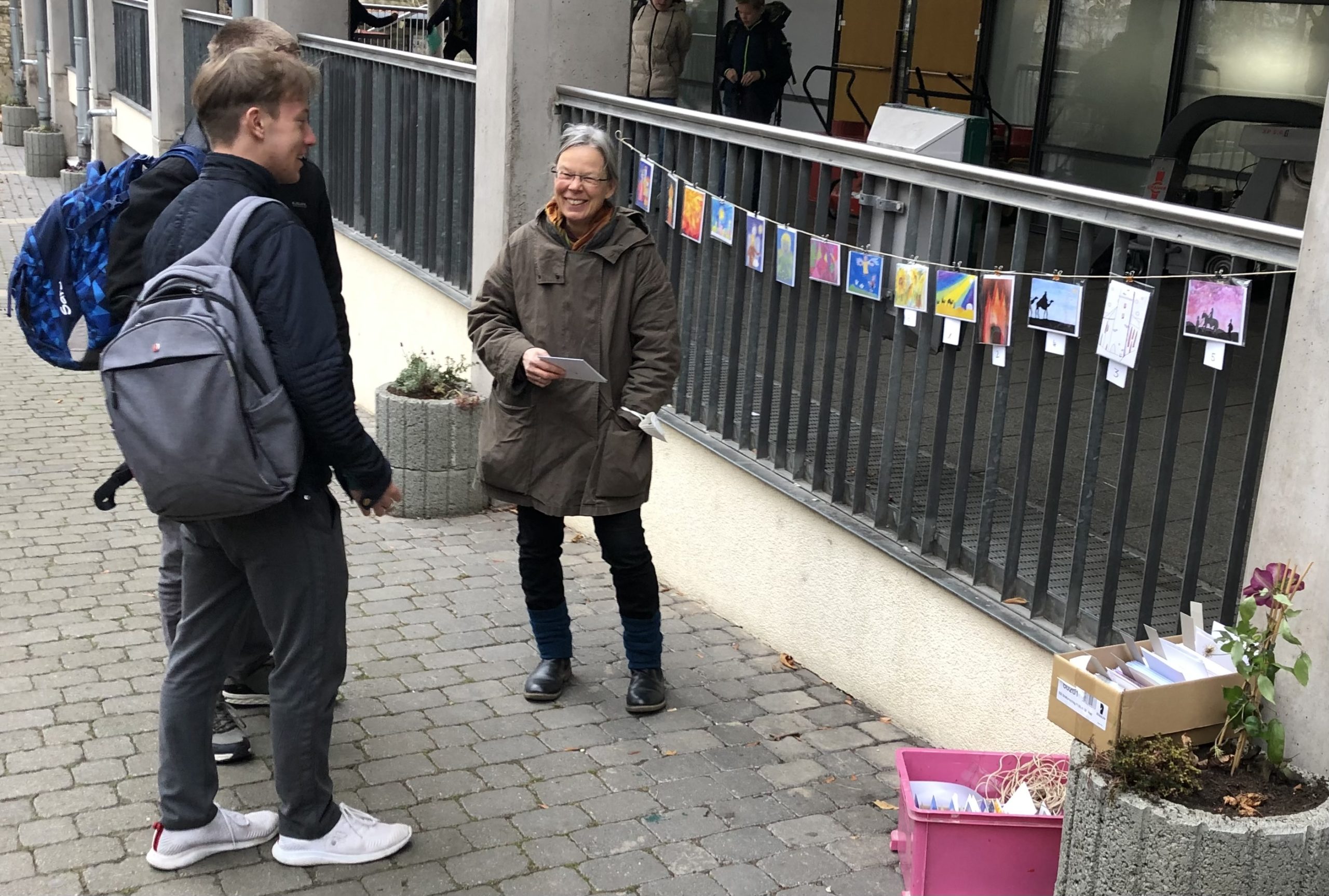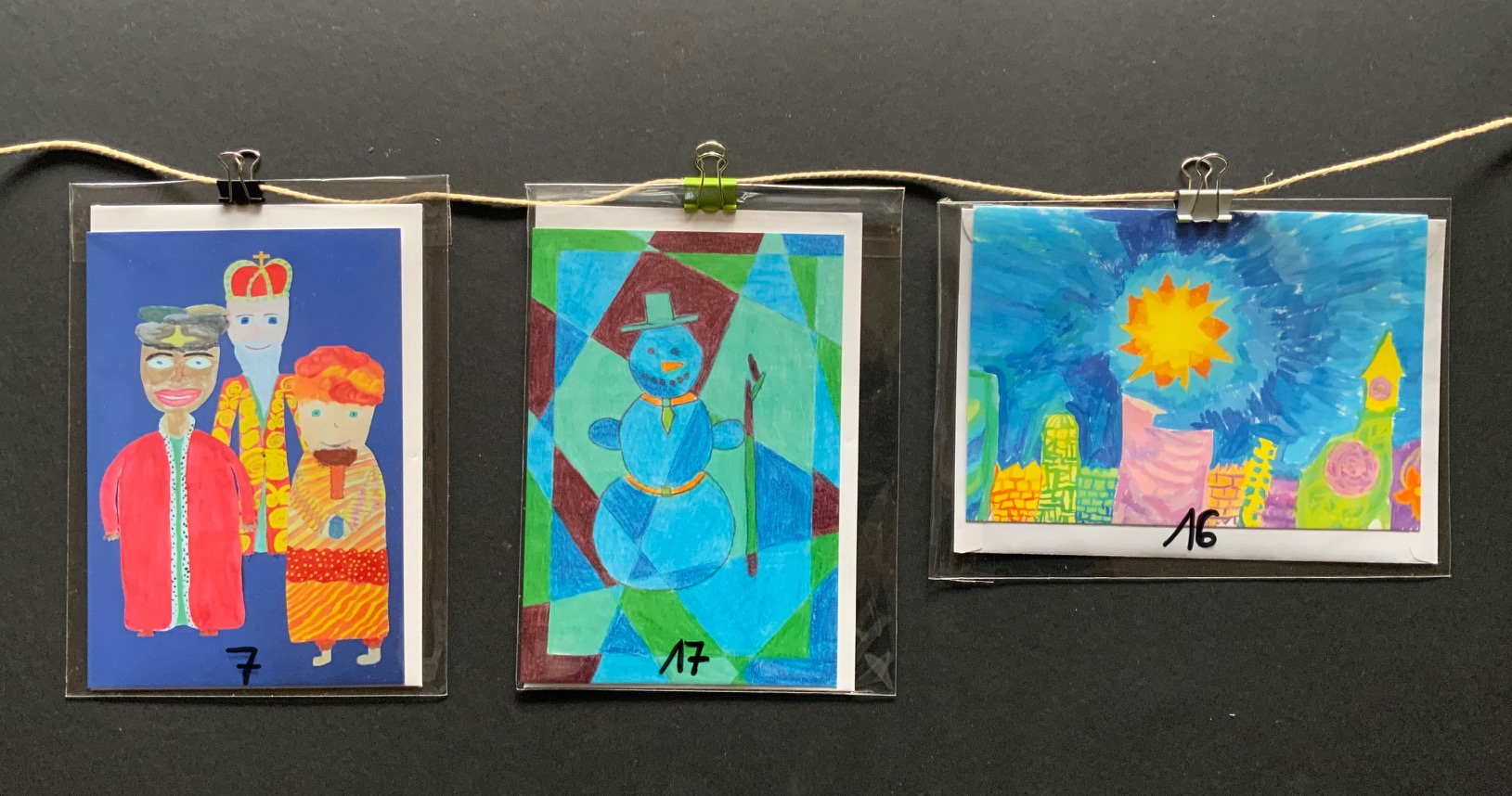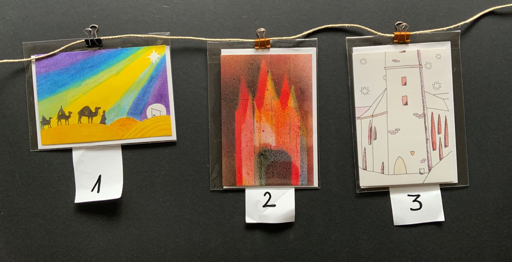 • Bestellen Sie direkt unter weihnachtskarten@ess-erfurt.de und überweisen Sie auf das Schulkonto der ESS unter dem Stichwort „Weihnachtskarten“. Wir geben die Karten dann über die Klasse aus. IBAN DE08 3706 0193 5000 1420 10, Pax Bank Köln. Geben Sie bei der Bestellung bitte Namen und Klasse an. Oder die Karten können im Kunstunterricht bezahlt und mitgenommen werden (Geld im Umschlag).