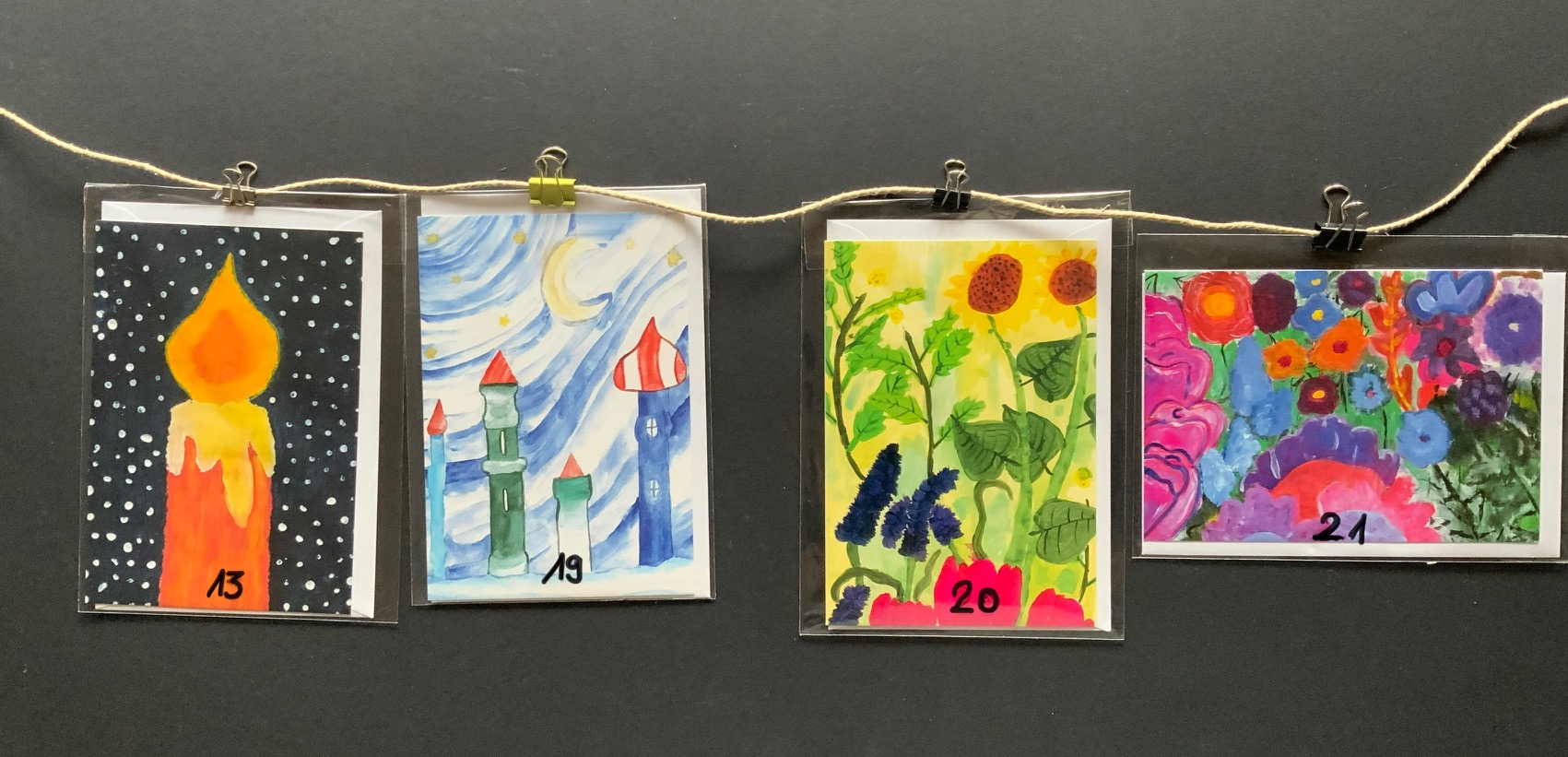 Es gibt sie wieder, unsere Weihnachtskarten! Allen widrigen Bedingungen zum Trotz. Manche Motive sind dieses Jahr auch im Homeschooling entstanden. Insgesamt gibt es sechs neue Karten: fünf Weihnachtsmotive und auf mehrfachen Wunsch auch wieder ein Blumenmotiv als neutrale Glückwunschkarte. Wie immer ganz herzlichen Dank an alle Künstlerinnen und Künstler!