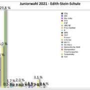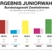 Pünktlich zur ersten Prognose der Bundestagswahlen werden auch die Ergebnisse der Juniorwahl veröffentlicht. Auch unsere Schule hat daran teilgenommen. Hier gibt es die Ergebnisse. Auf der Seite kann man die regionalen und lokalen Zahlen begutachten. Die detaillierten Ergebnisse für unsere Schule folgen am morgigen Tag. Auf jeden Fall war die Wahlbeteiligung höher, als bei der Bundestagswahl.
