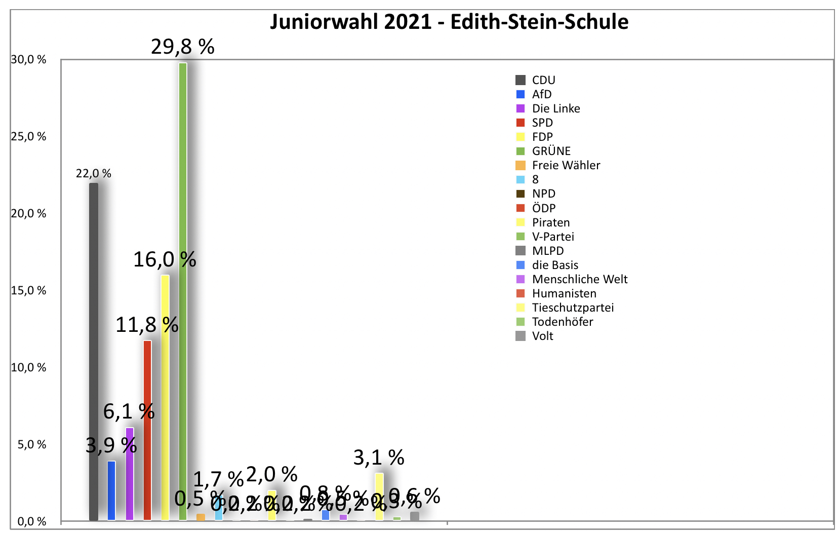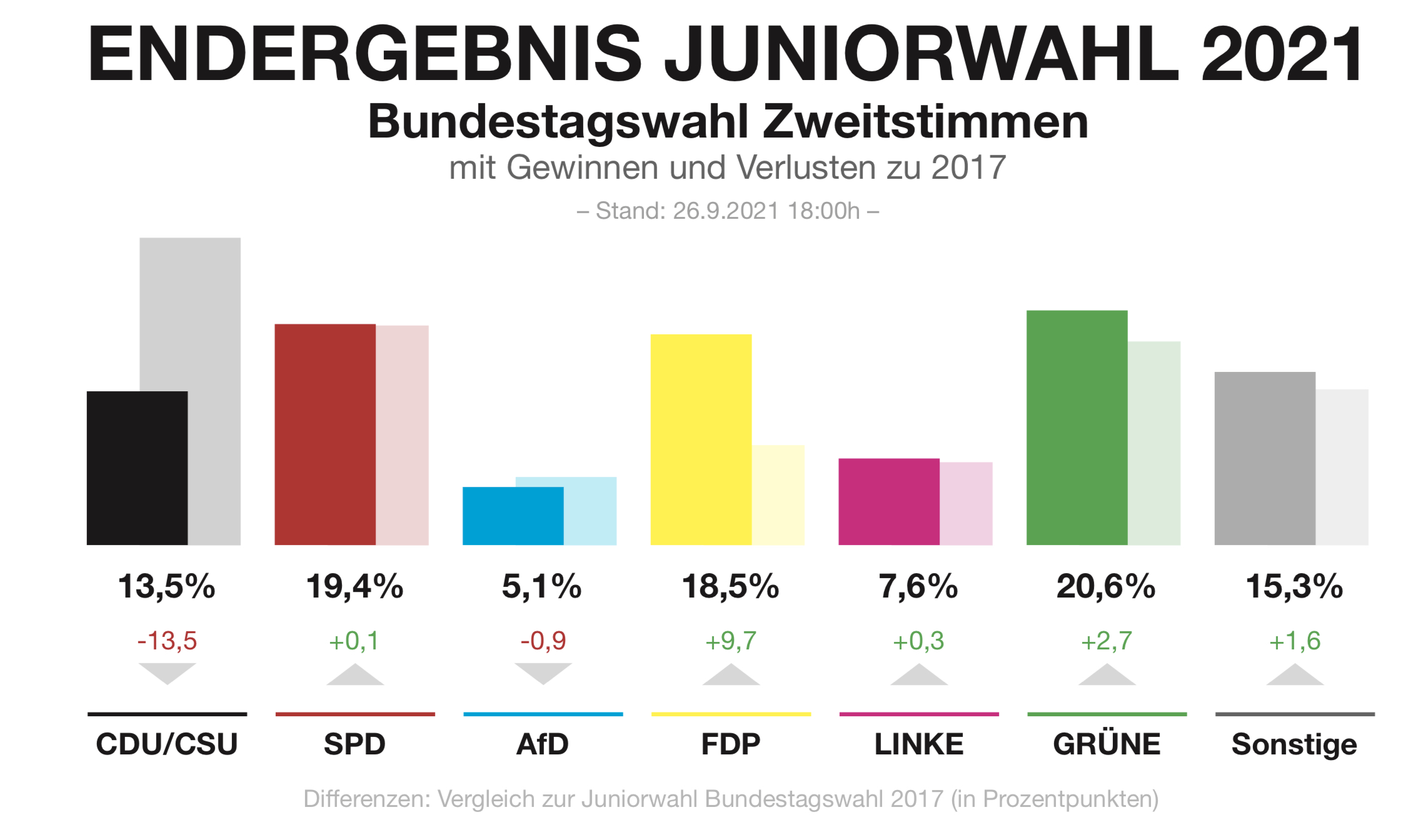 Pünktlich zur ersten Prognose der Bundestagswahlen werden auch die Ergebnisse der Juniorwahl veröffentlicht. Auch unsere Schule hat daran teilgenommen. Hier gibt es die Ergebnisse. Auf der Seite kann man die regionalen und lokalen Zahlen begutachten. Die detaillierten Ergebnisse für unsere Schule folgen am morgigen Tag. Auf jeden Fall war die Wahlbeteiligung höher, als bei der Bundestagswahl.