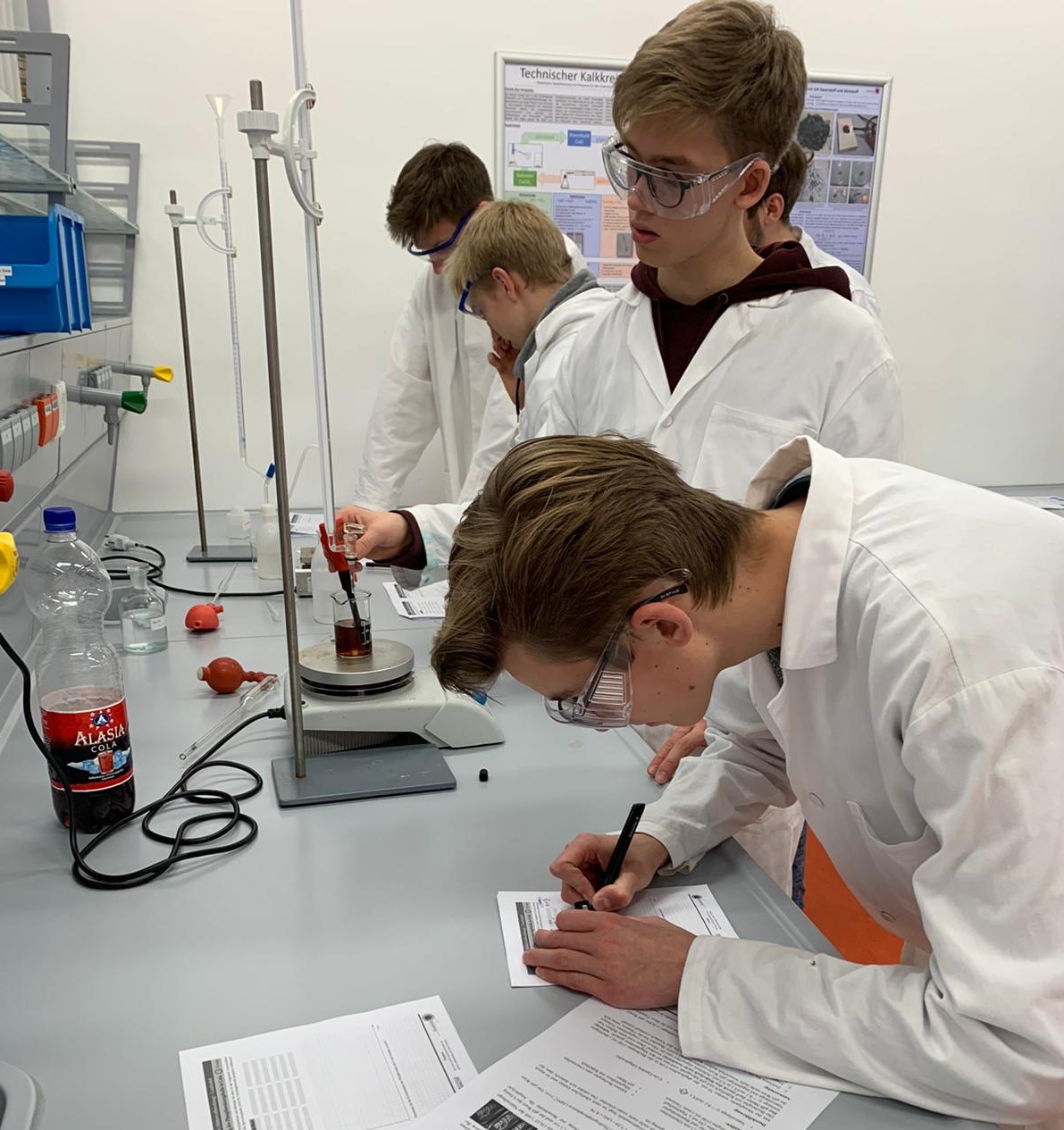 Wir, der Chemie-Kurs 11 eA, waren am 28. November im Schülerlabor in Jena. Dort konnten wir nach einer kurzen Einführung durch zwei Studenten an sieben verschiedenen Stationen Experimente zur Titration durchführen. Dabei handelt es sich um ein chemisches Verfahren, durch das Stoffe neutralisiert werden können. Nach zwei Stunden in denen Messwerte notiert, Weinflaschen entkorkt und Erlenmeyerkolben geschwenkt wurden, verbrachten wir noch etwas Zeit in der Goethe Galerie und fuhren am Nachmittag wieder mit dem Zug heim.